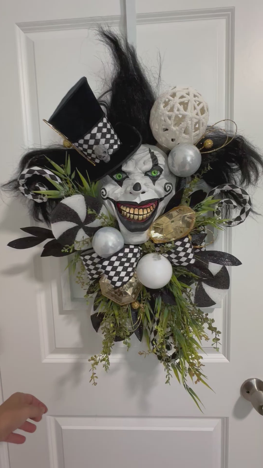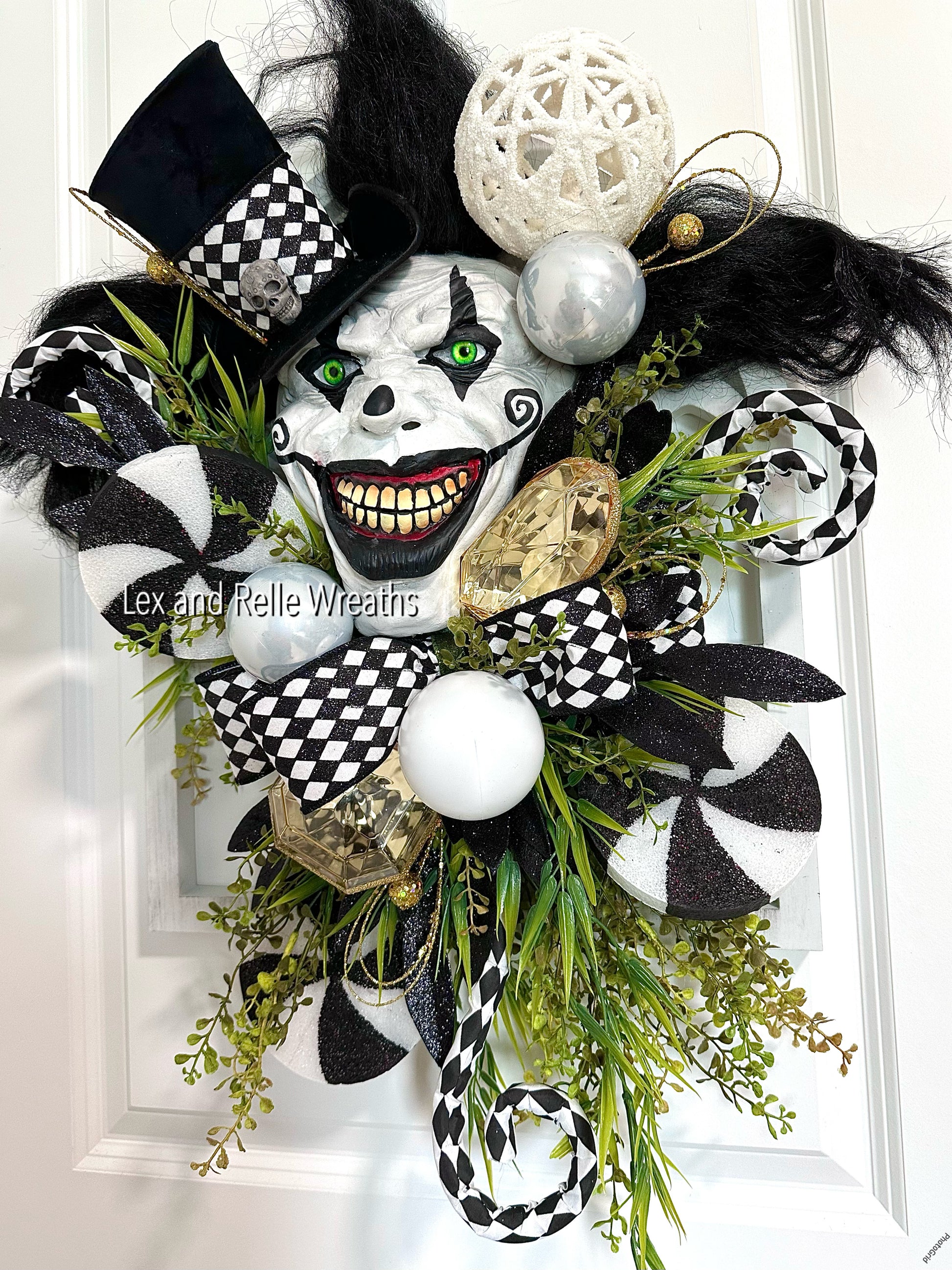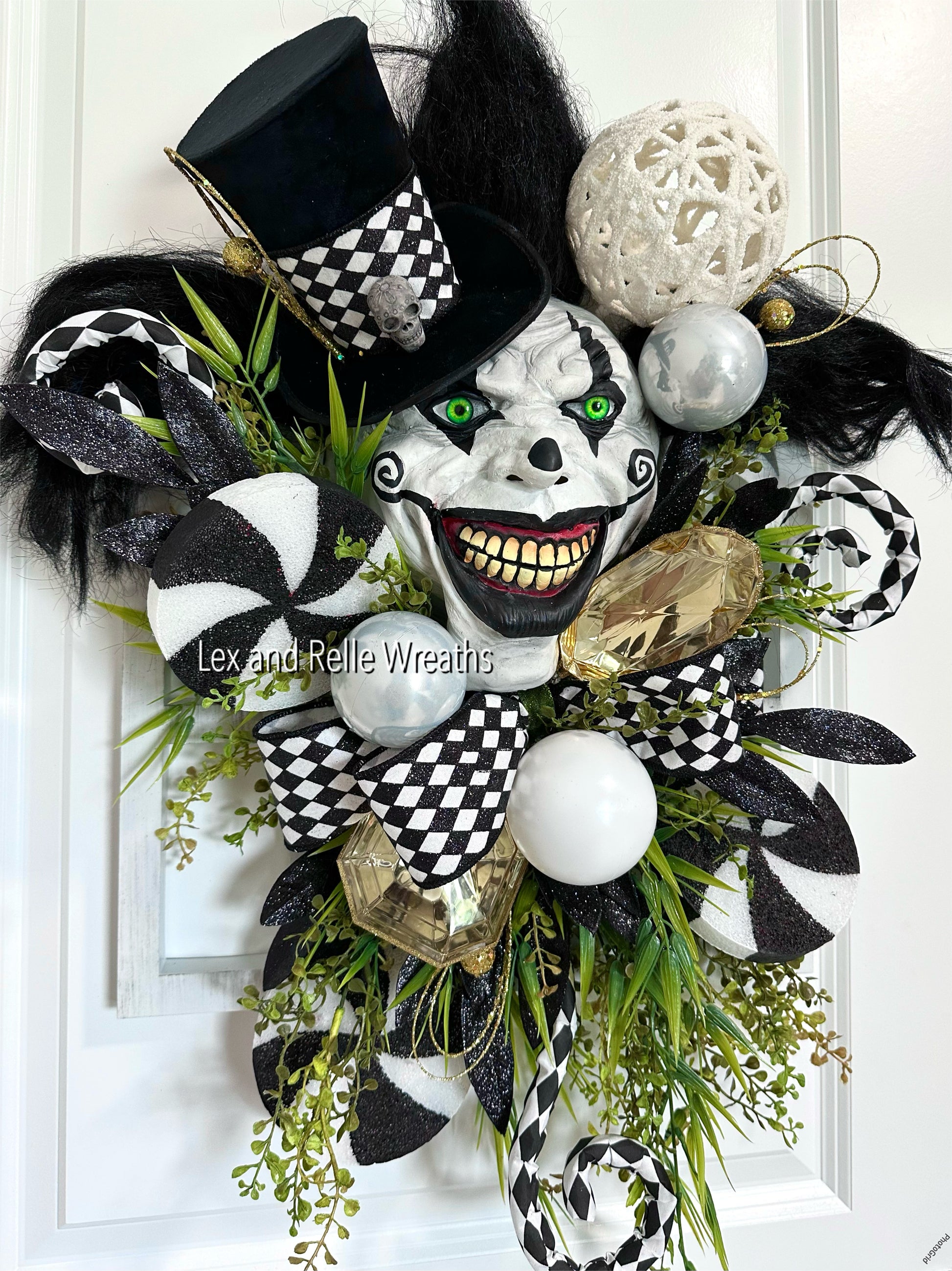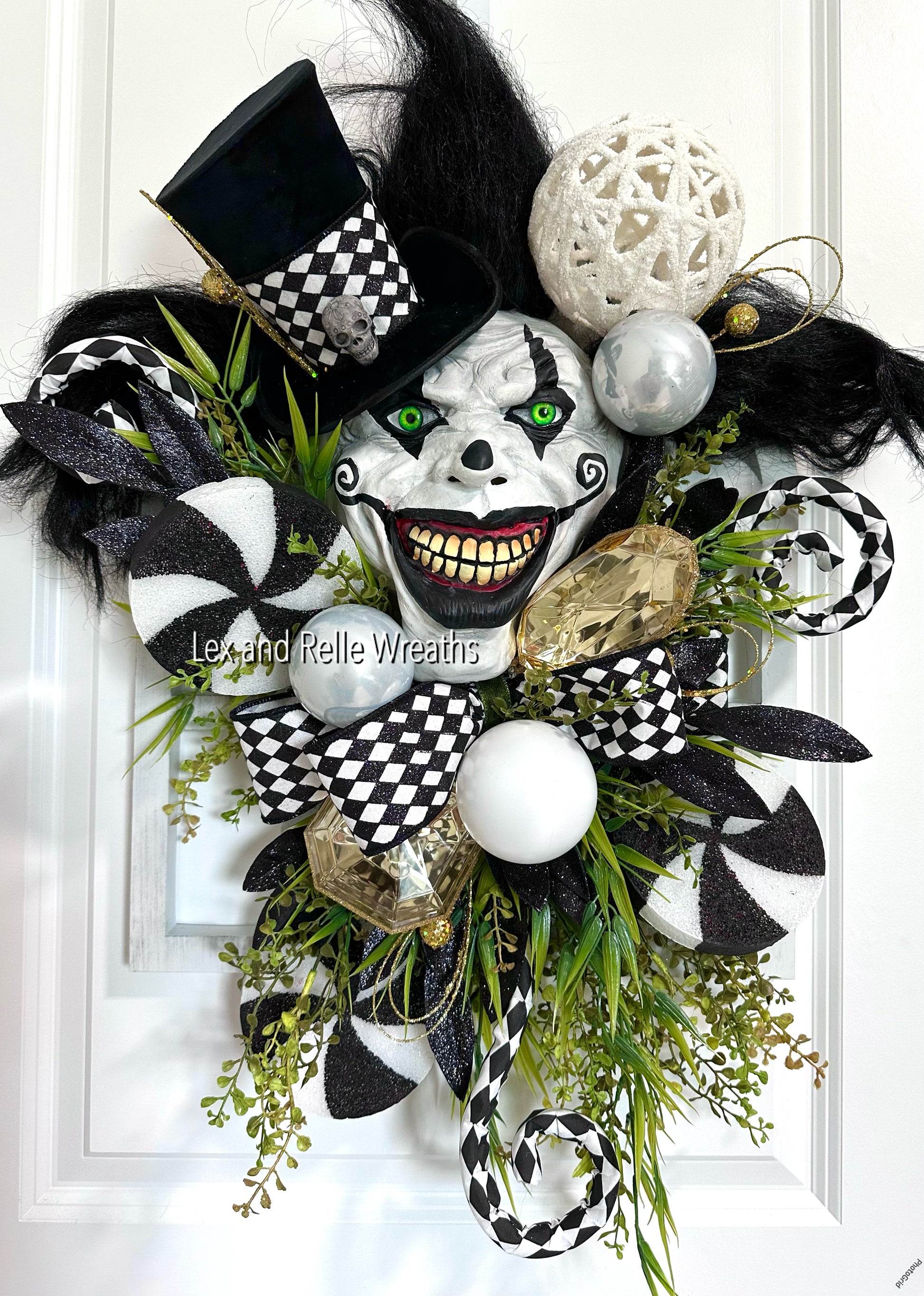 Greet your spooky friends this season with this scary cheerful clown on your door. Filled with Mixed greenery, harlequin bows, top hat, gold gems, black and white peppermint discs, and ornaments.