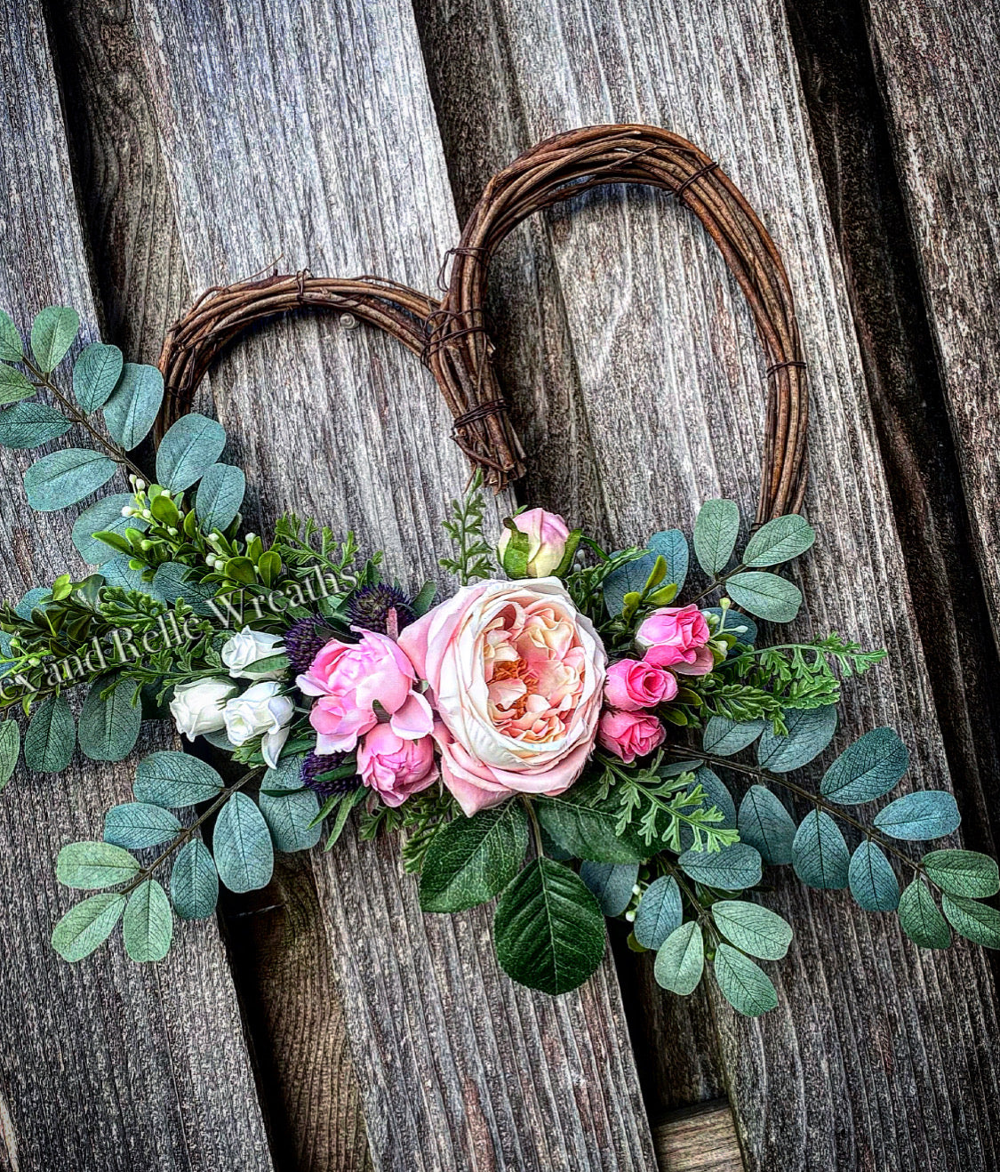 Heart wreath with pink Cabbage Rose, peonies, and tiny roses