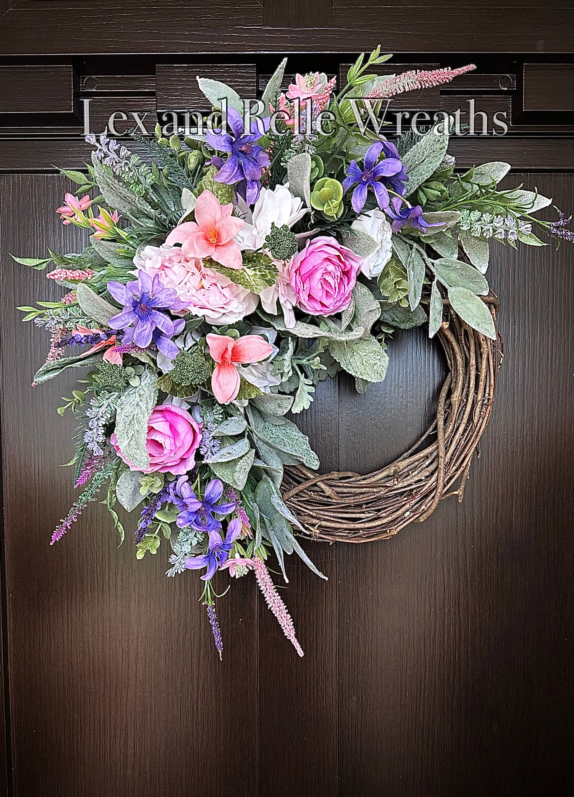This gorgeous spring wreath is designed with the prettiest color pallet of lavender, violet, and soft pinks, as well as a beautiful mix of greenery like lambs ear, eucalyptus, and Dusty Miller.