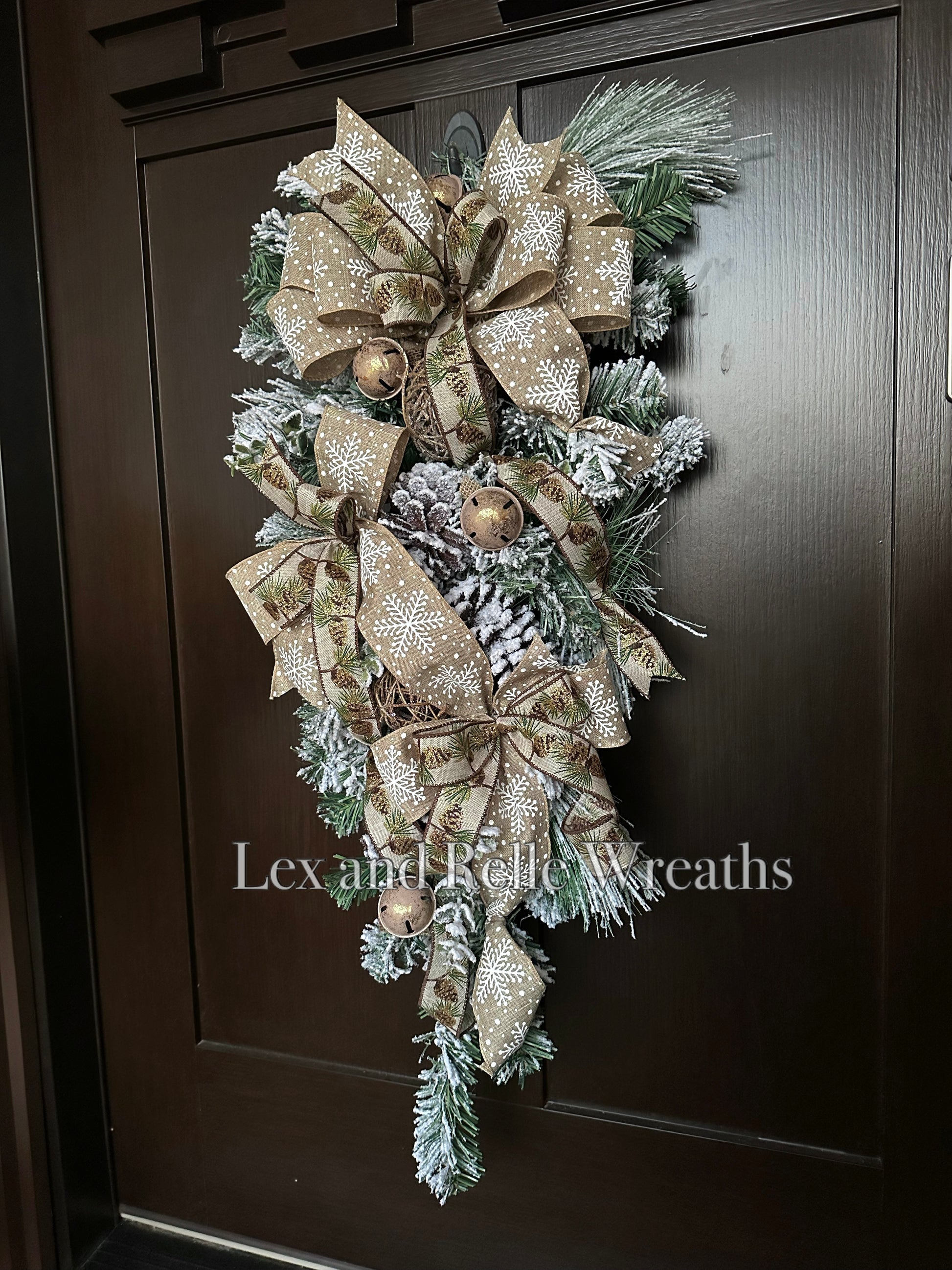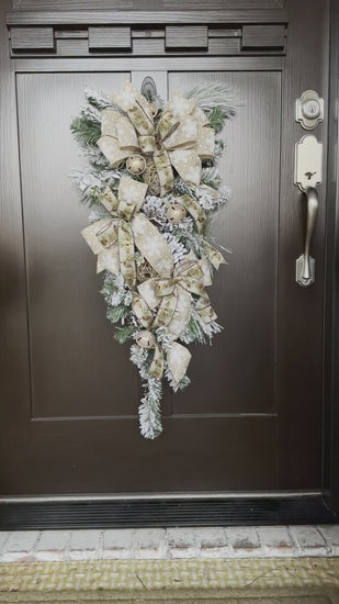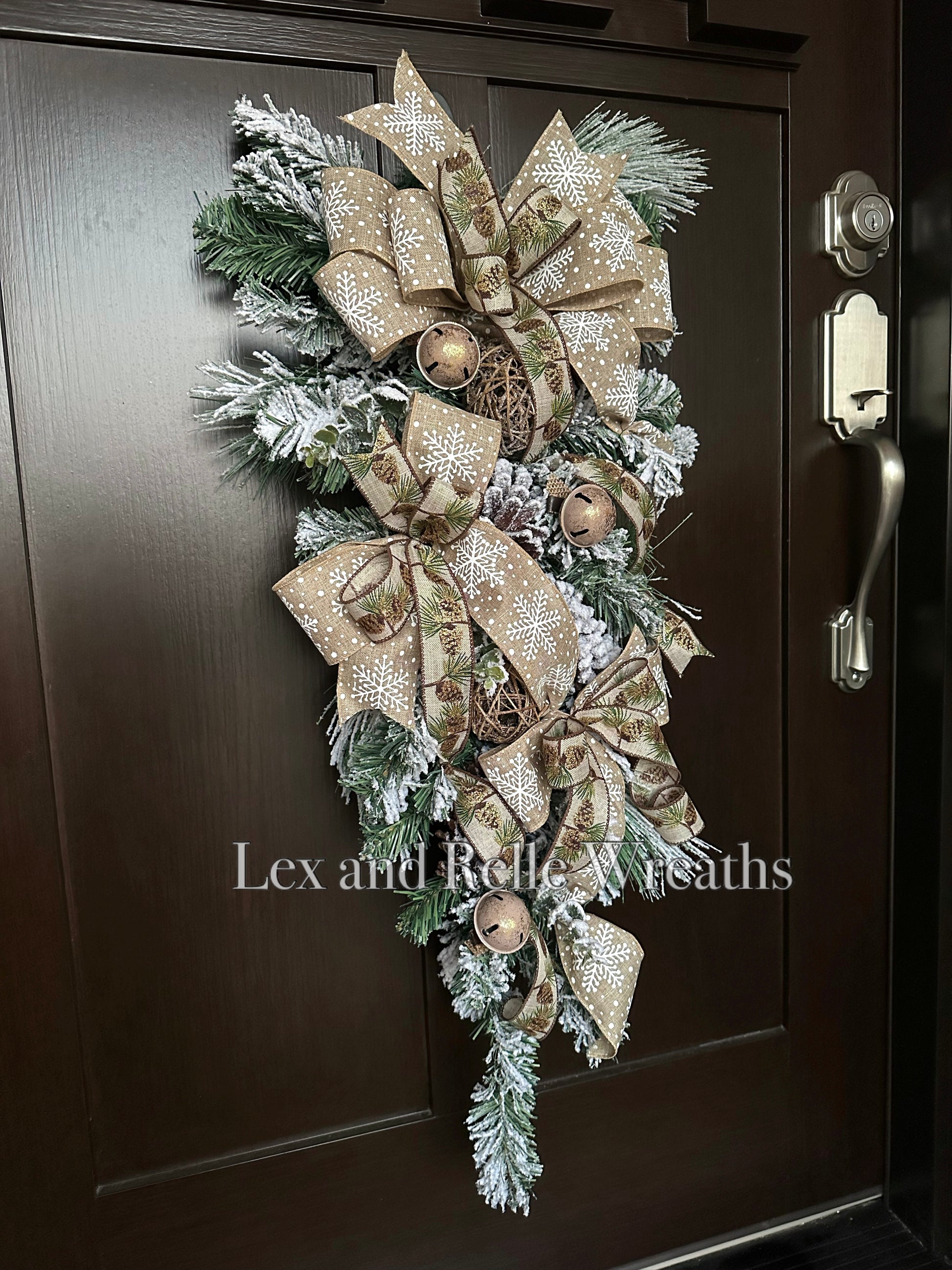 An elegant winter door swag with flocked evergreen, pine cones, frosted rattan balls, gold rusted jingle bells, and plenty of wintery bows. Hang all winter long.