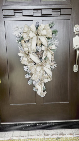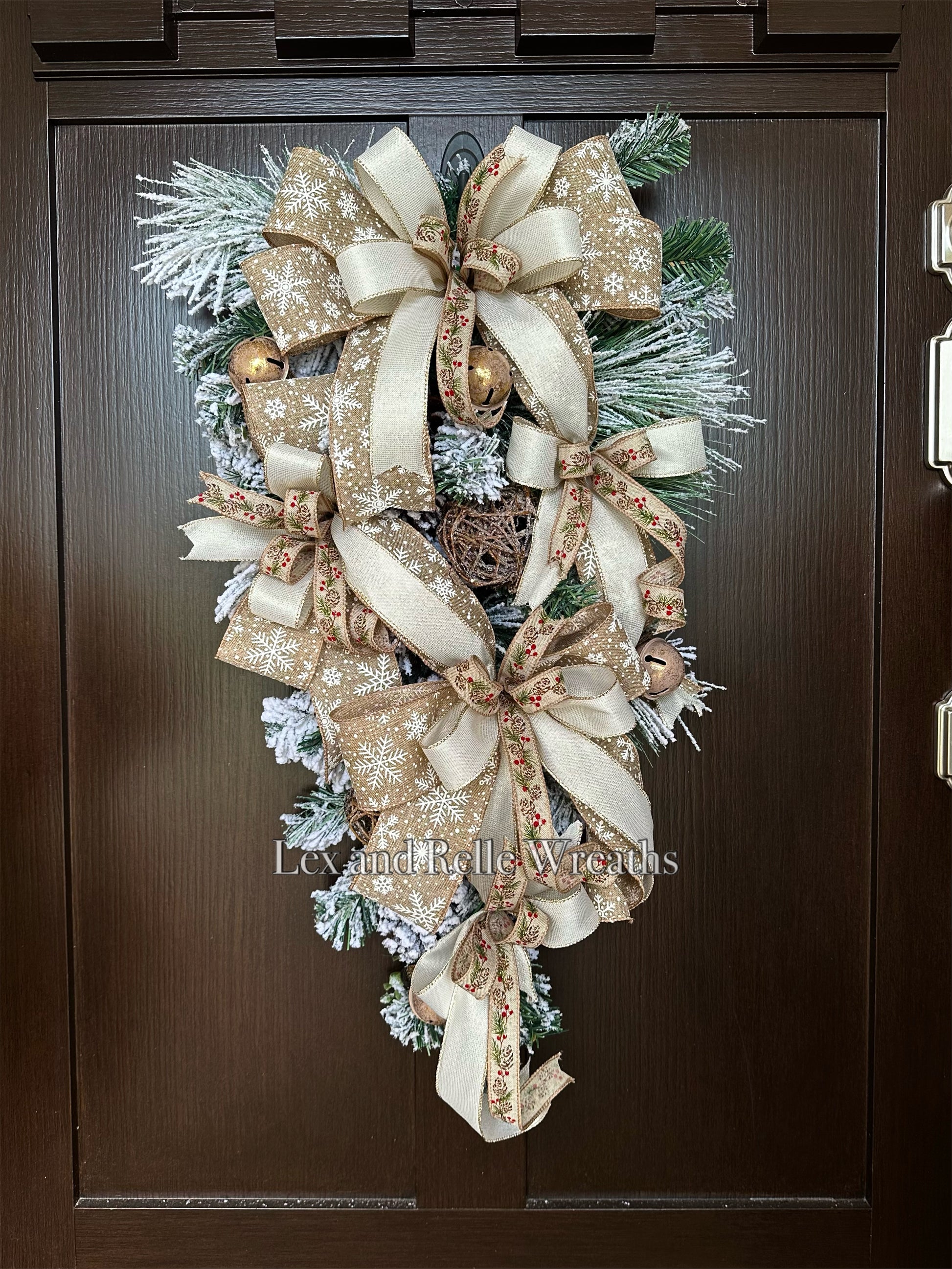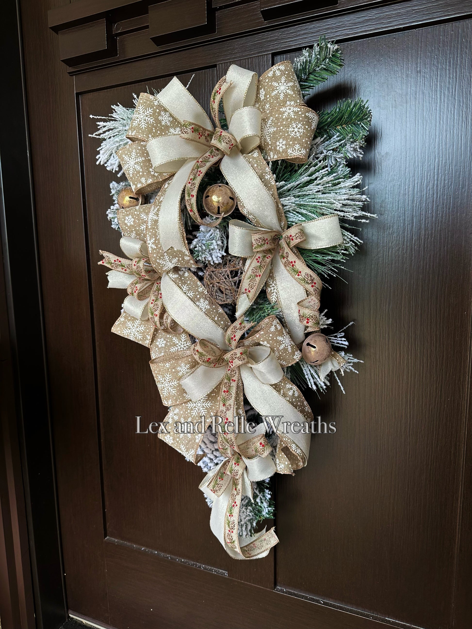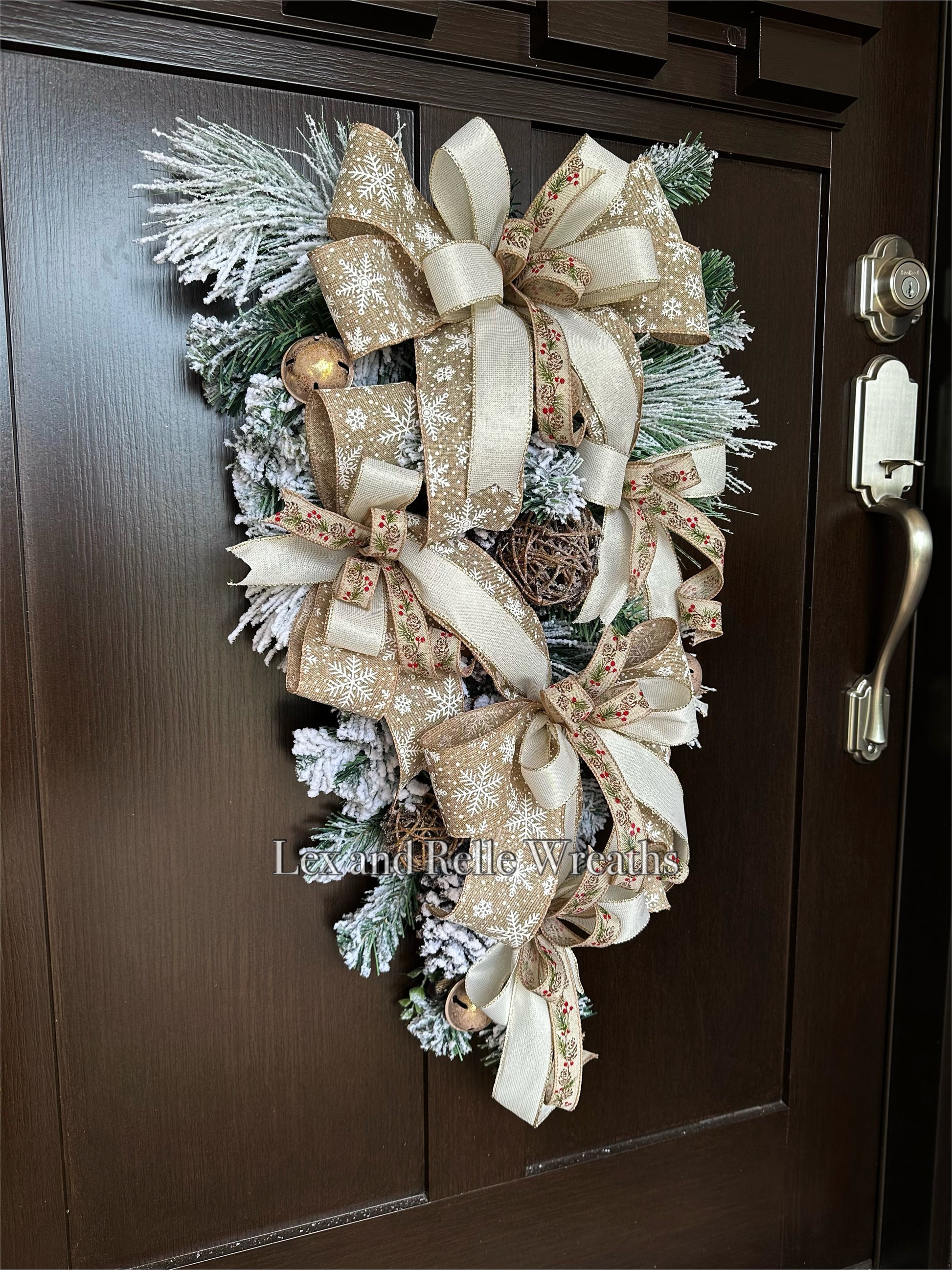 An elegant winter door swag with flocked evergreen, pine cones, frosted rattan balls, gold rusted jingle bells, and plenty of wintery bows. Hang all winter long.