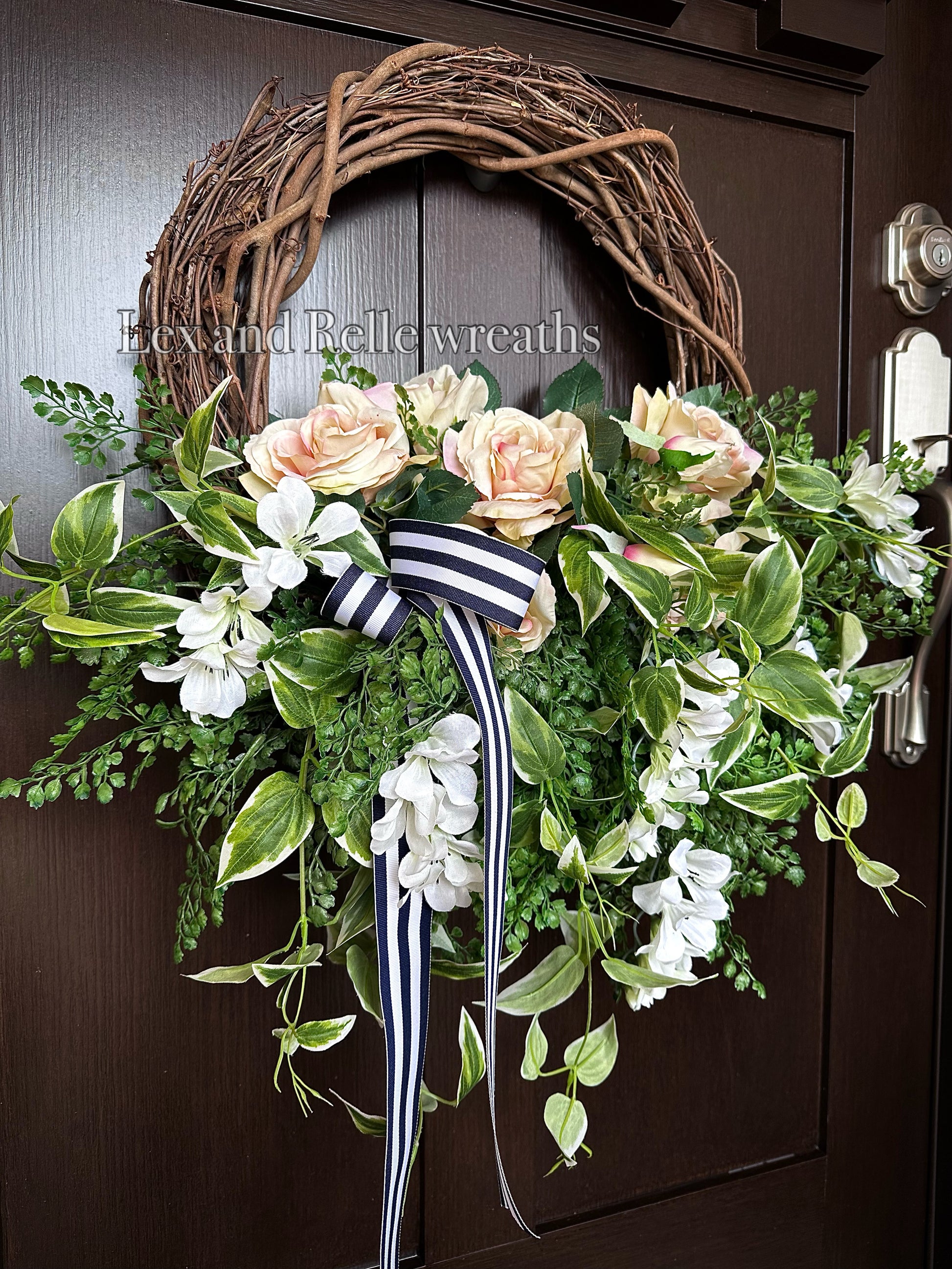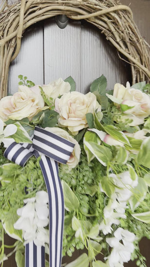 Filled with lush greenery like Maiden Hair, Variegated leaves, and gorgeous full roses. Hang this beauty all Spring and Summer.