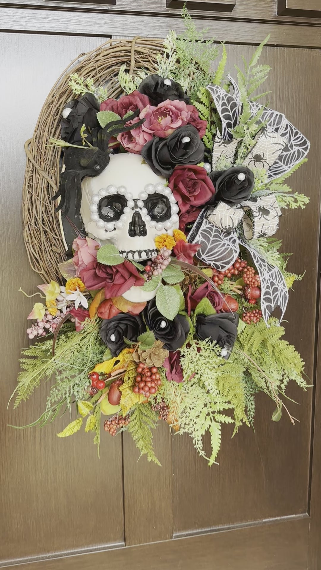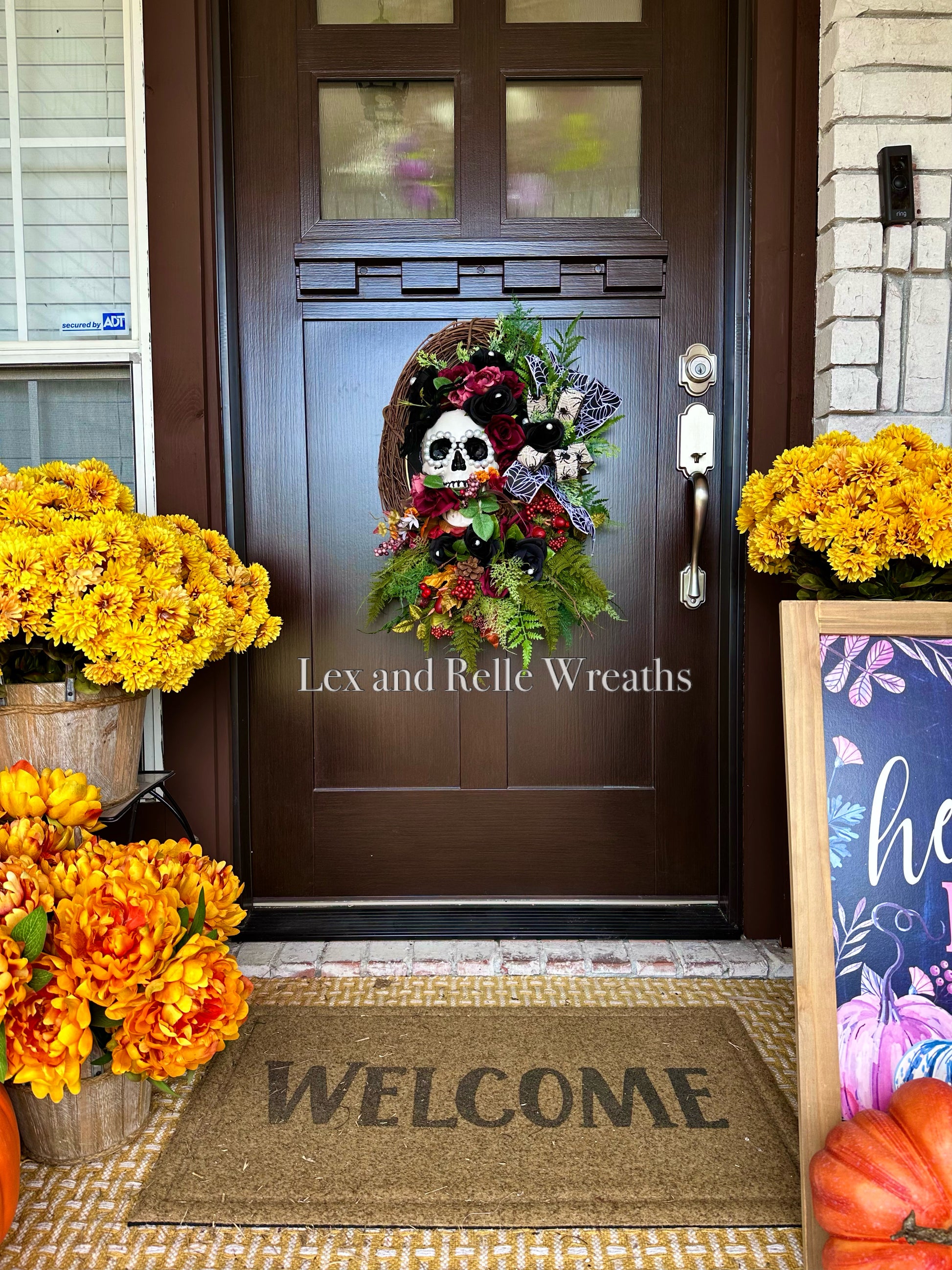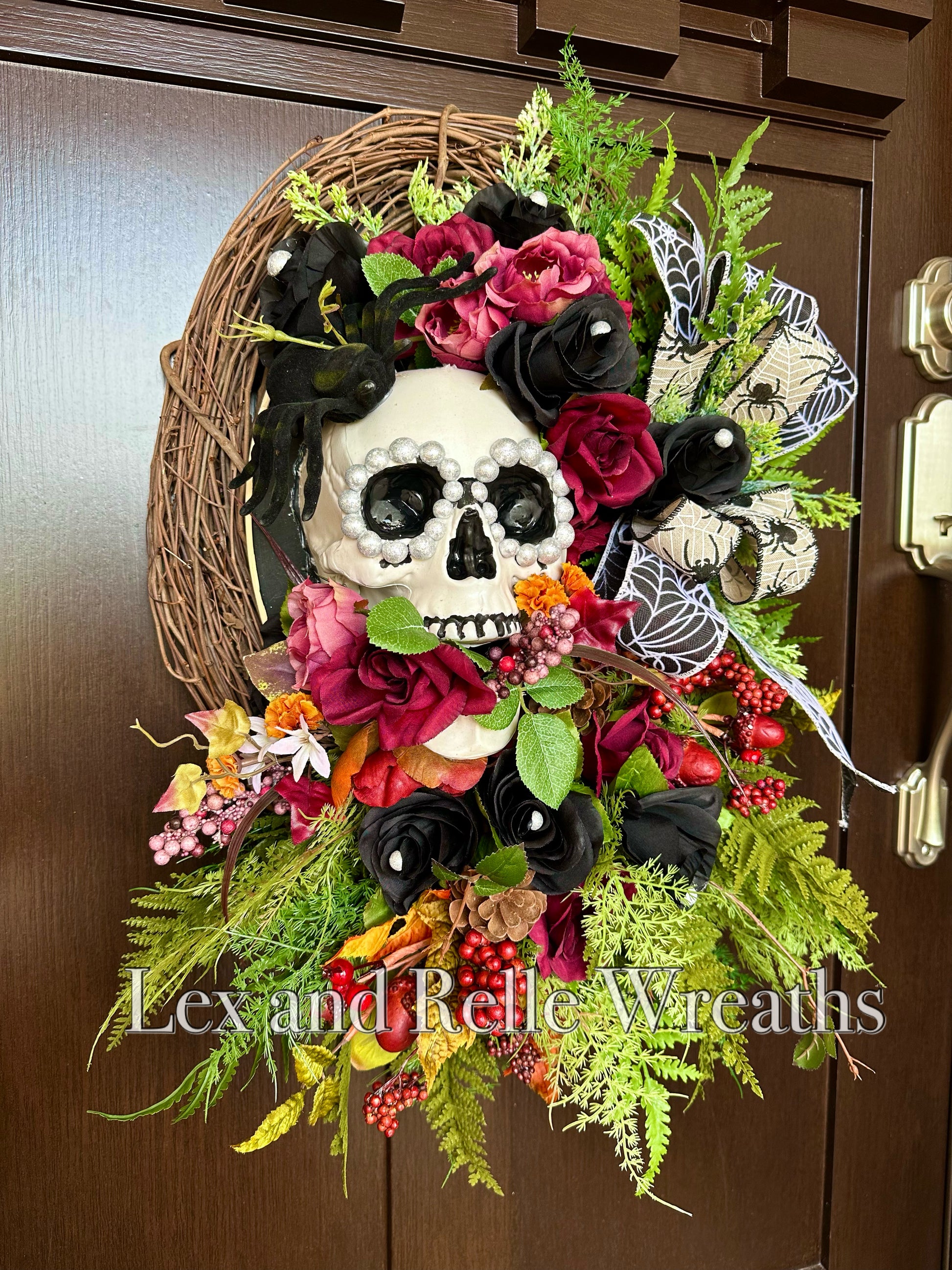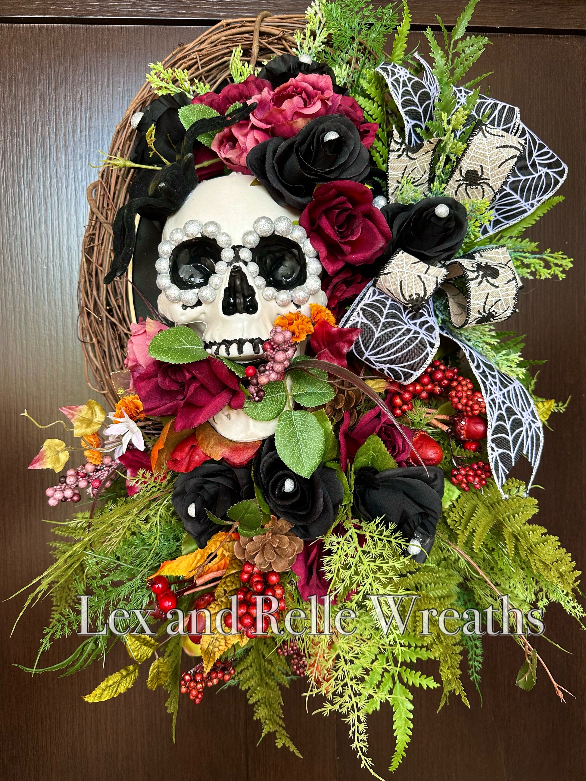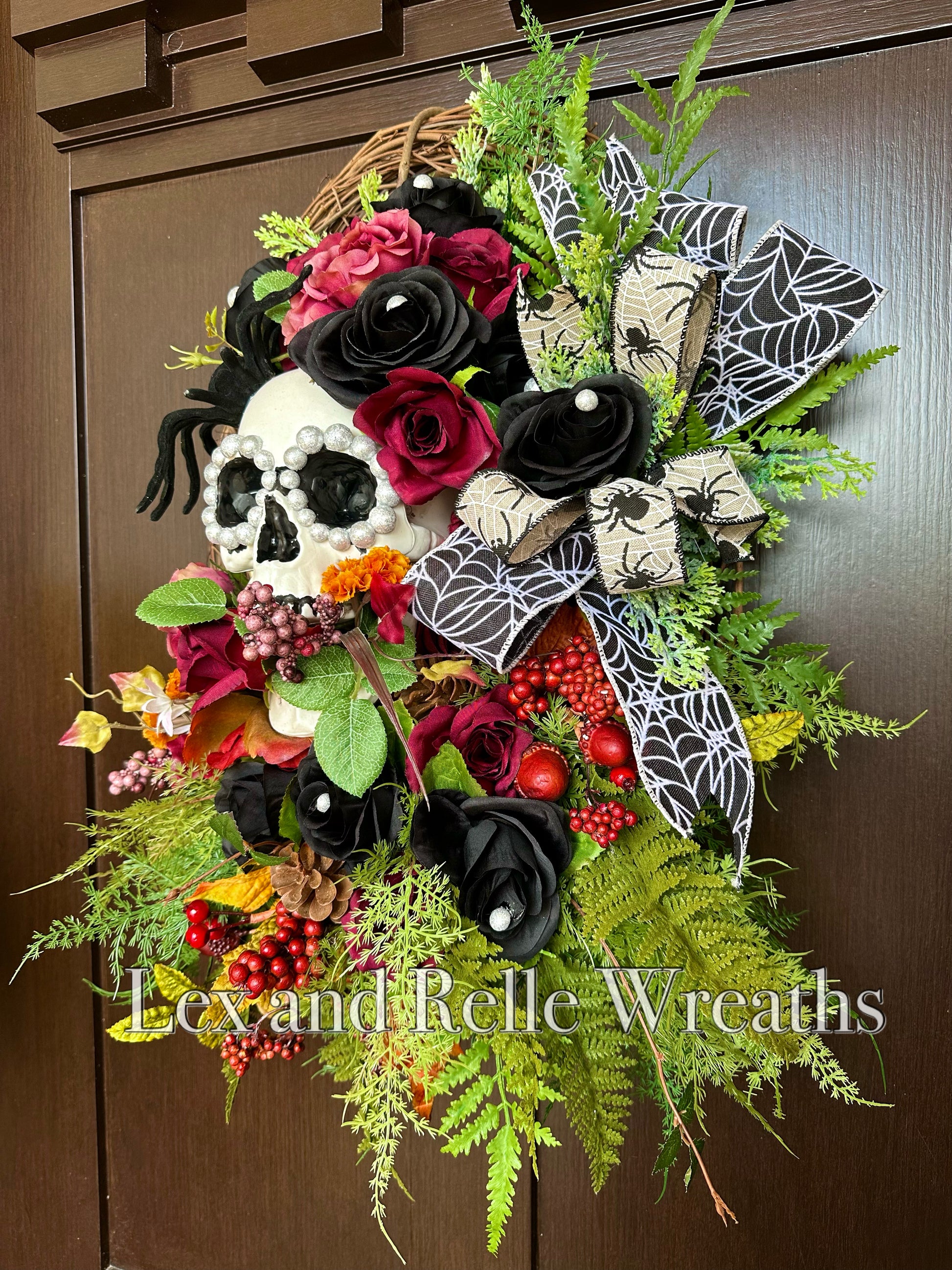 Isadora is a fancy addition to your door this season. Designed on an oval wreath frame. Decorated with black and red roses, berries, fern greenery, a spooky- pretty skull, and a big bow.