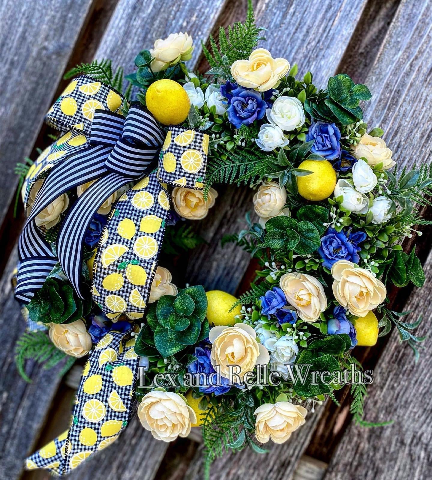 Yellow and blue florals with faux lemons and a pretty lemon bow
