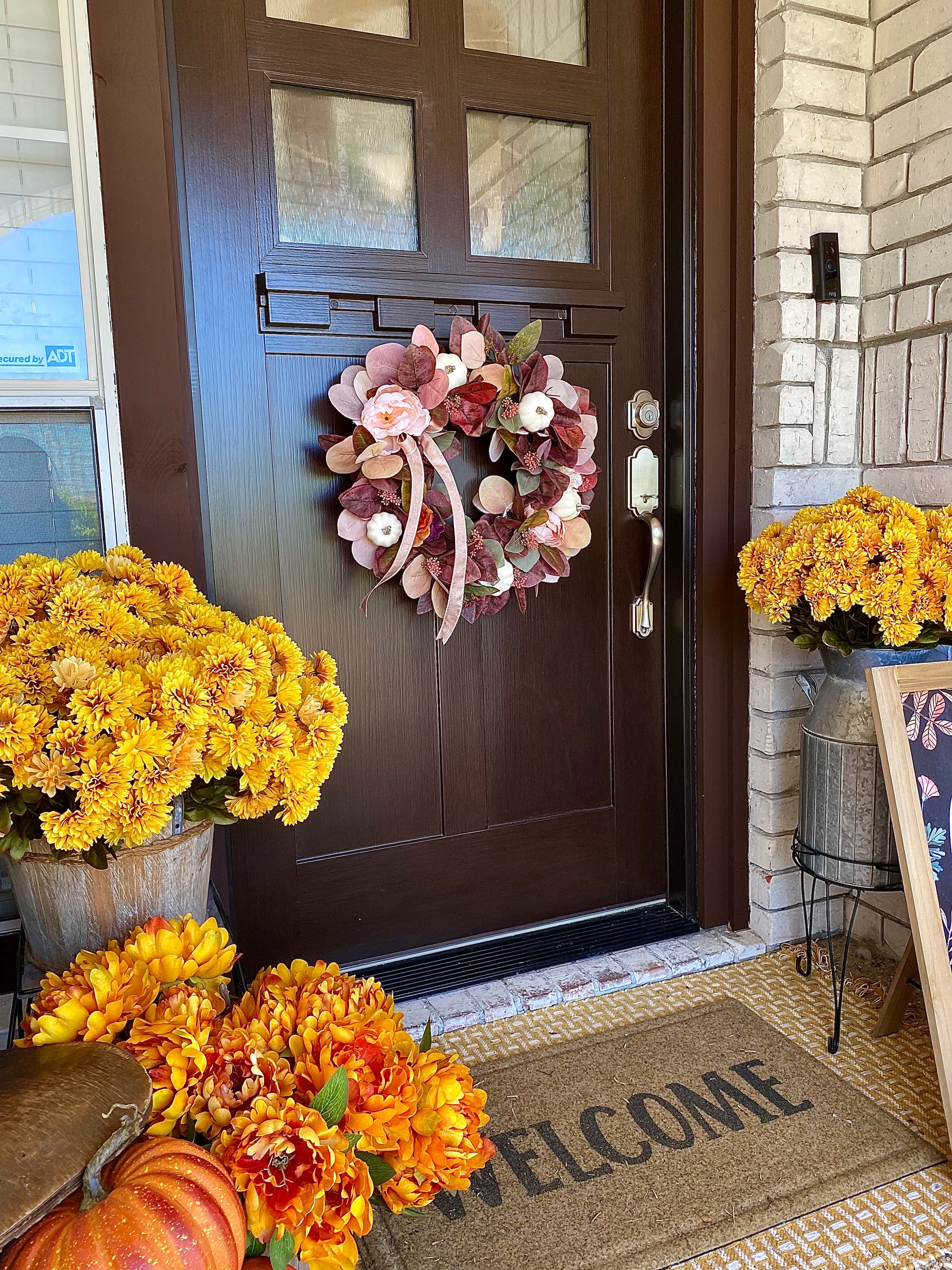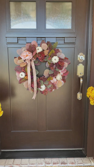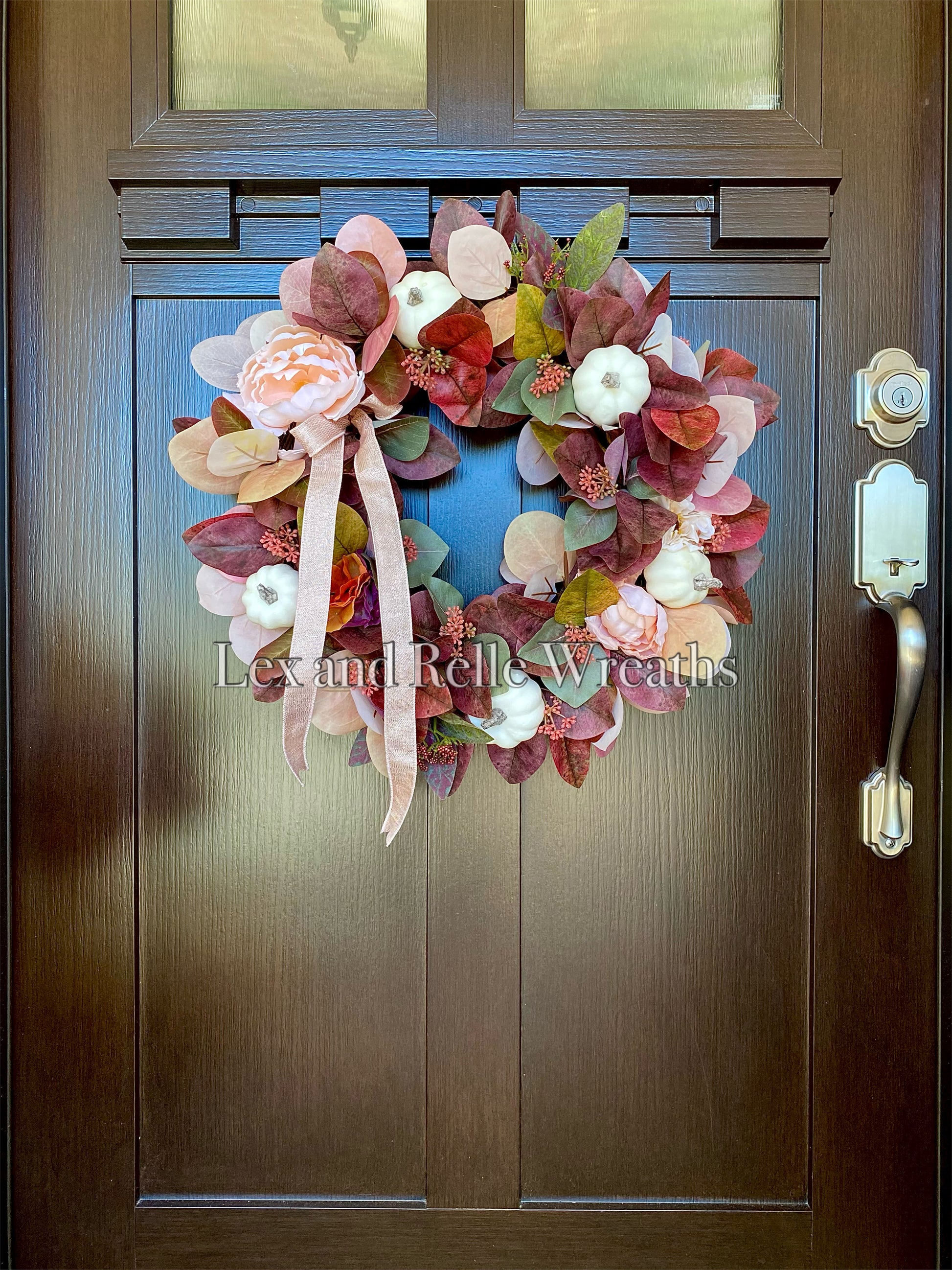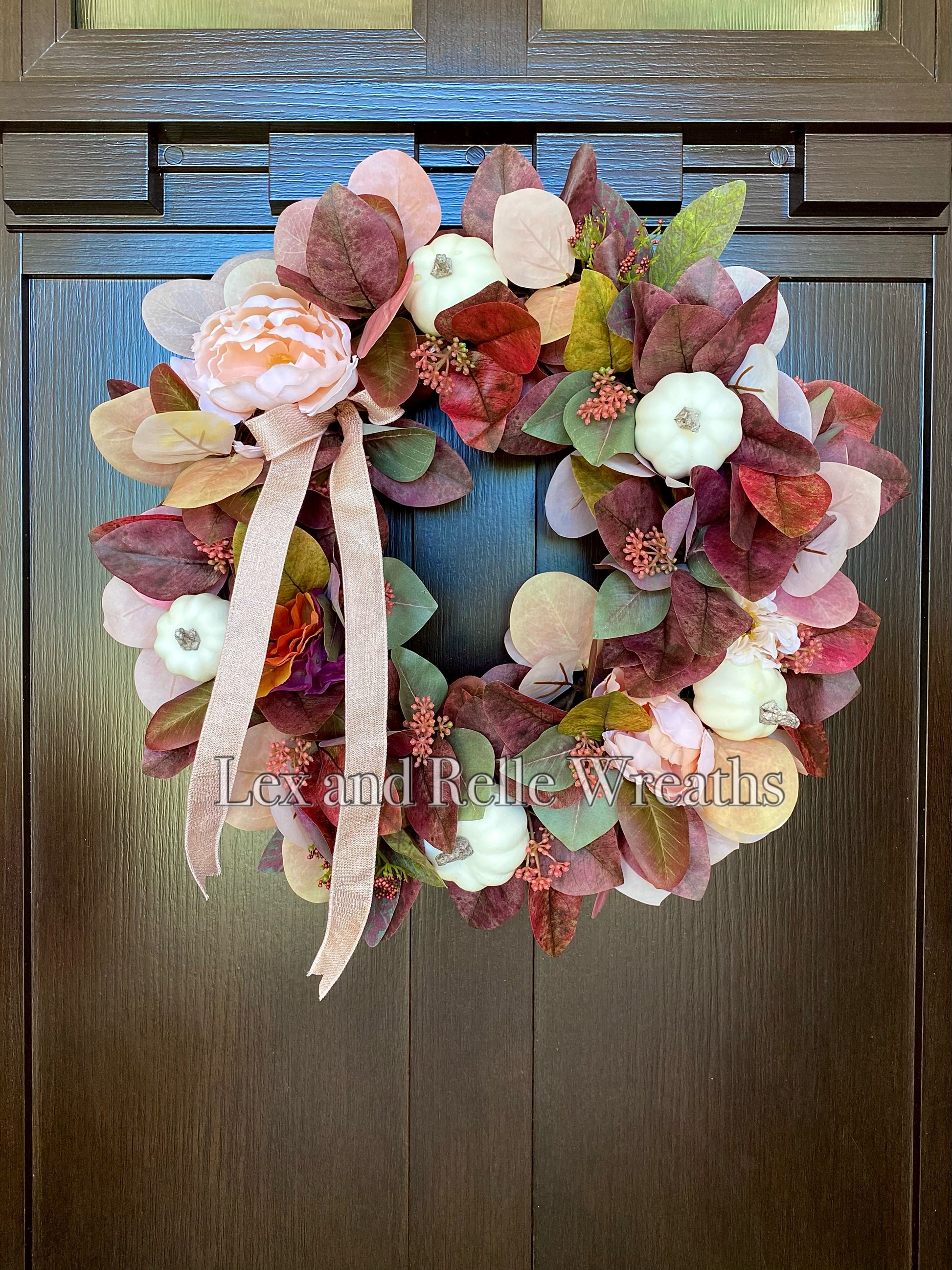 Little white pumpkins nestled in a burgundy and blush leafy Autumn wreath. Simple and elegant.