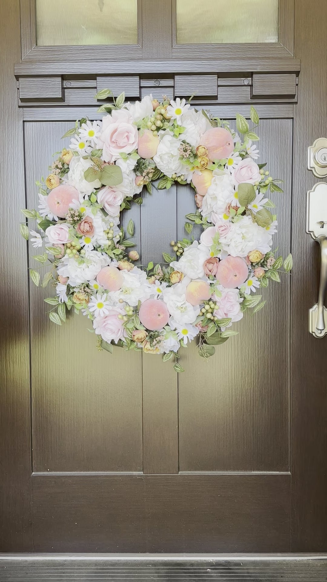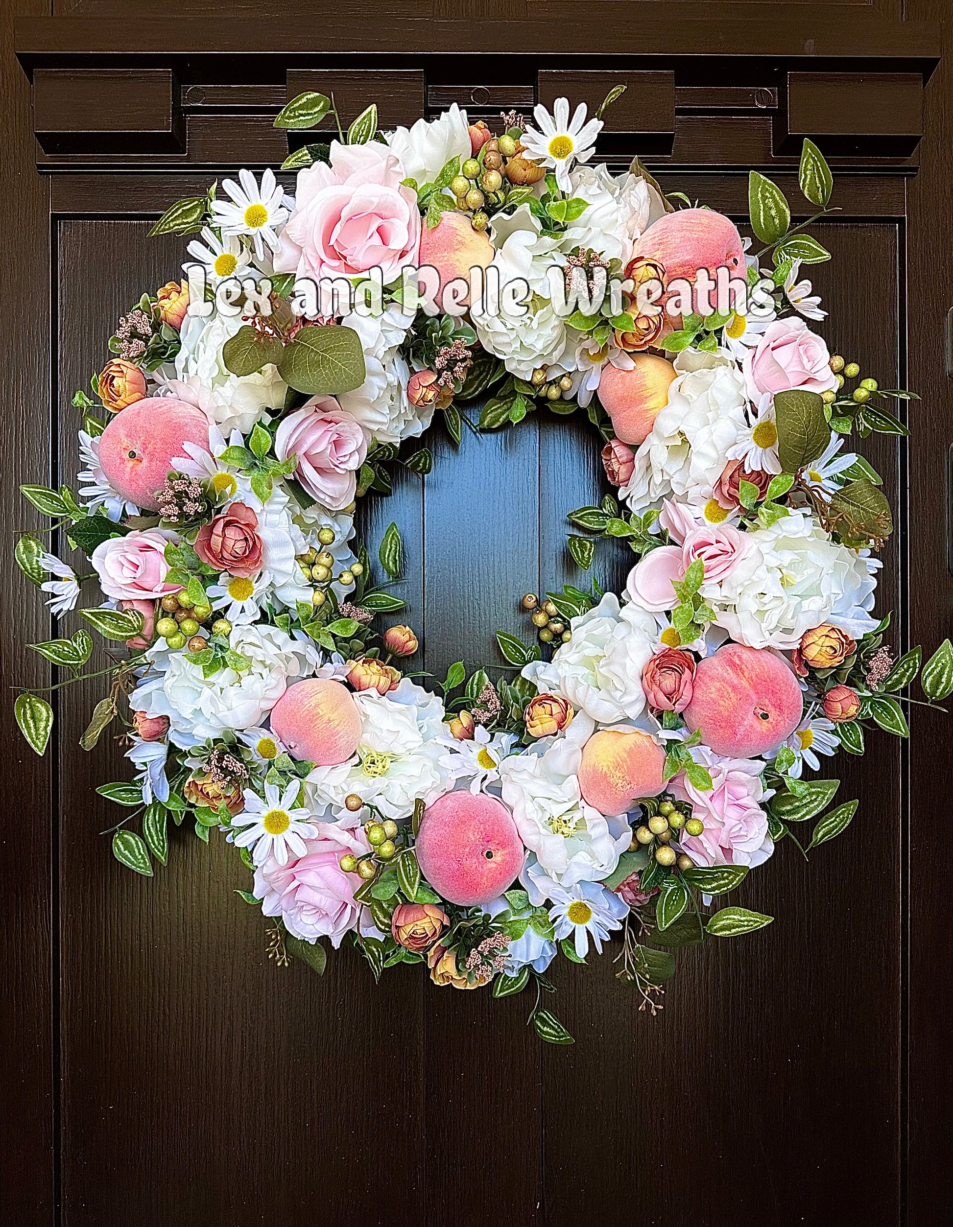 Filled with peonies, roses, daisies, berries and peaches, big and small. Hang this beauty all Summer and early Fall.