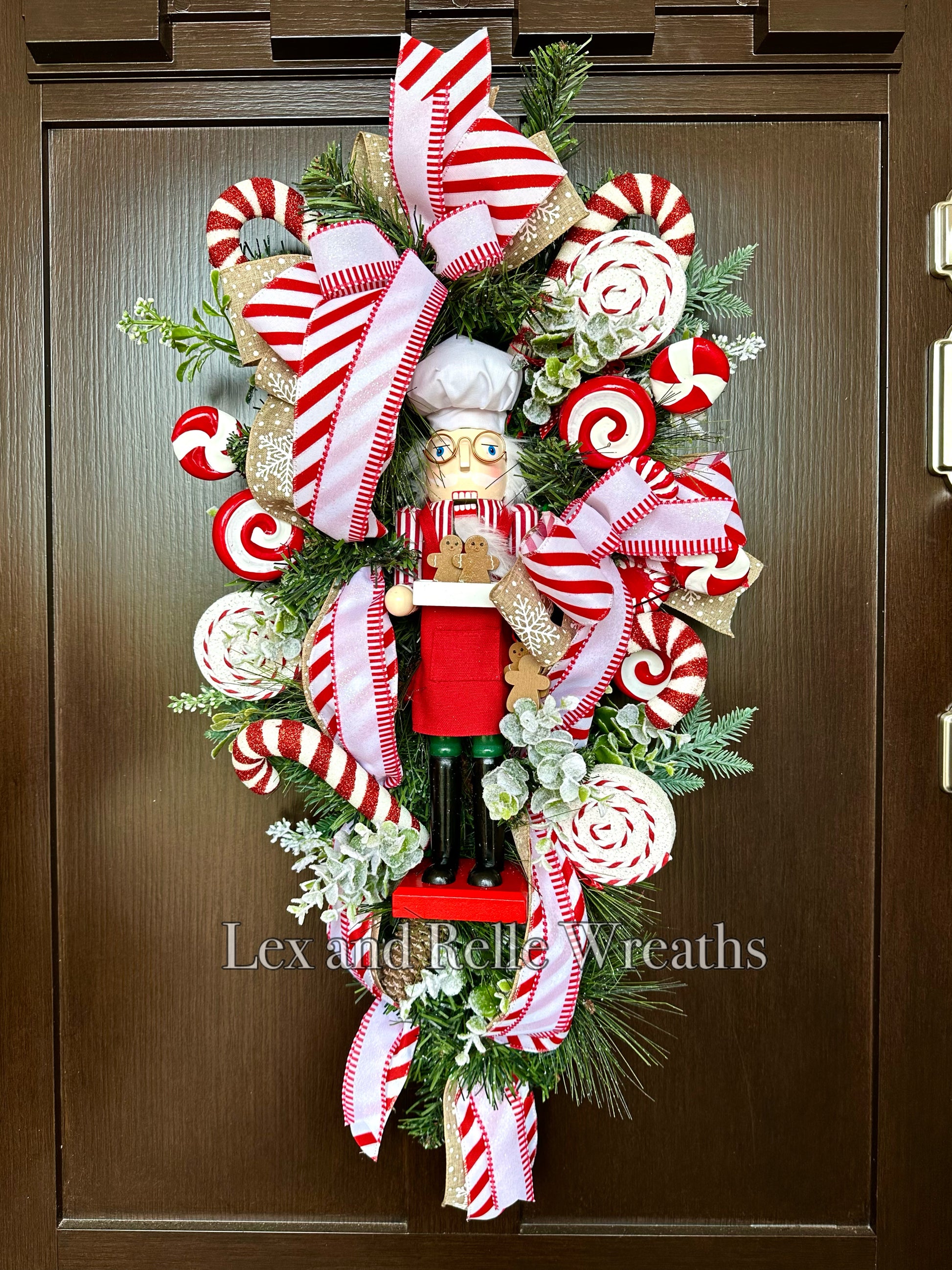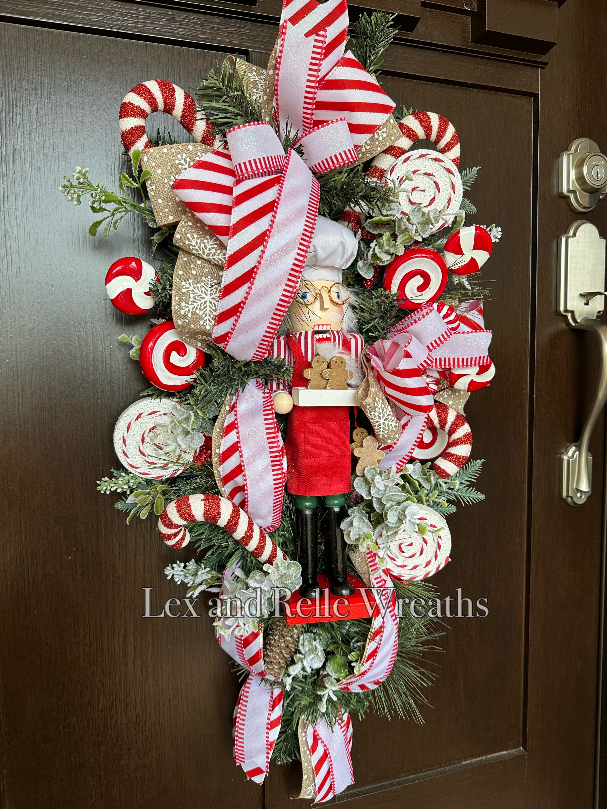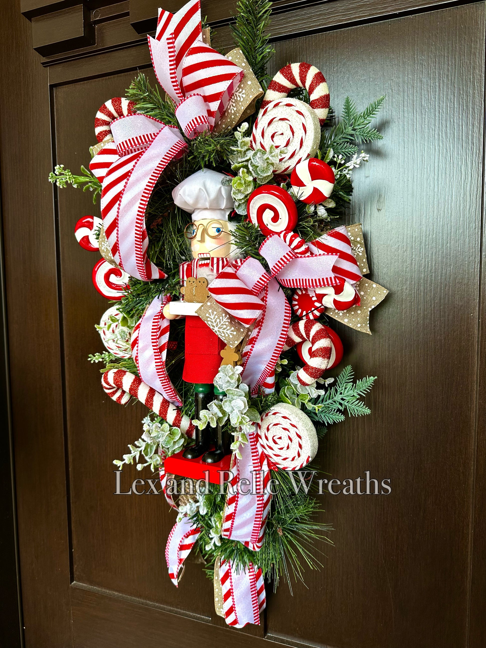 Peppermint Nutcracker Swag filled with peppermint picks, peppermint lollies, candy canes, bows and frosted eucalyptus. The perfect addition to your peppermint themed Christmas decor.