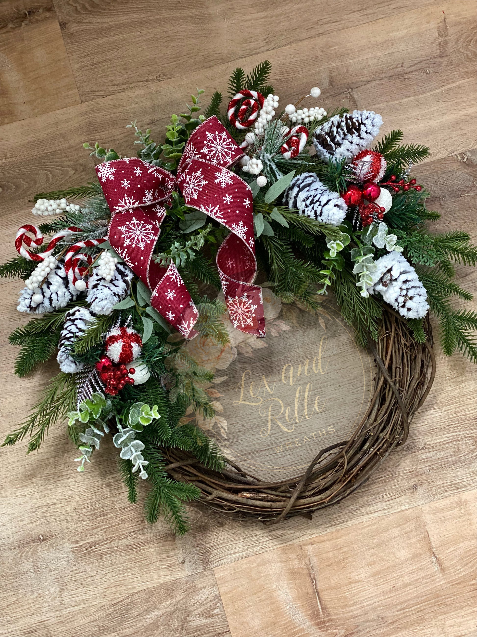 Filled with frosted Pine cones, peppermint & berry picks, flicked eucalyptus and red snowflake bow.