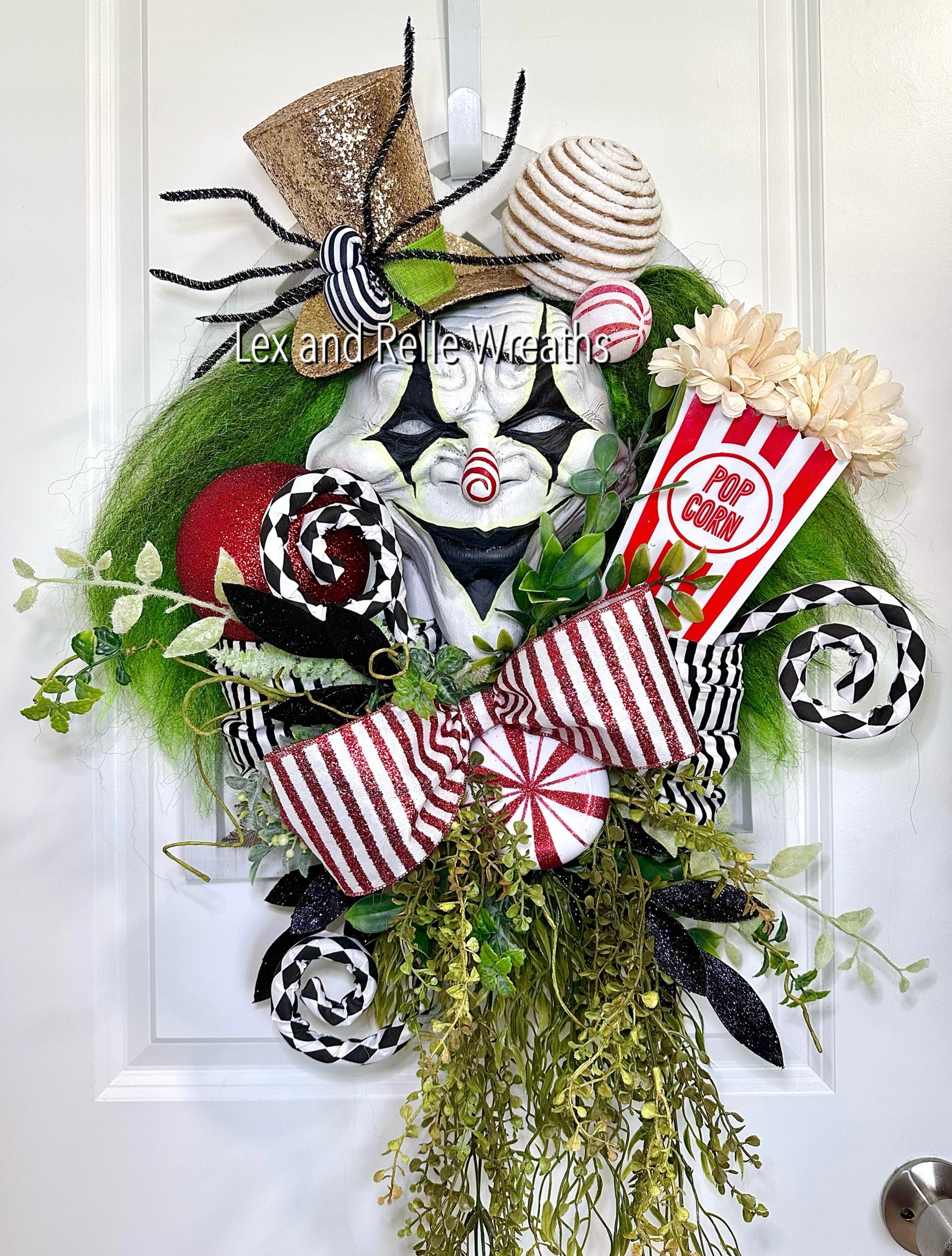 A wild haired clown that glows in the dark screams spooky Halloween. Filled with Mixed Greenery, harlequin curls, red and white ornaments, popcorn prop, and big bows.
