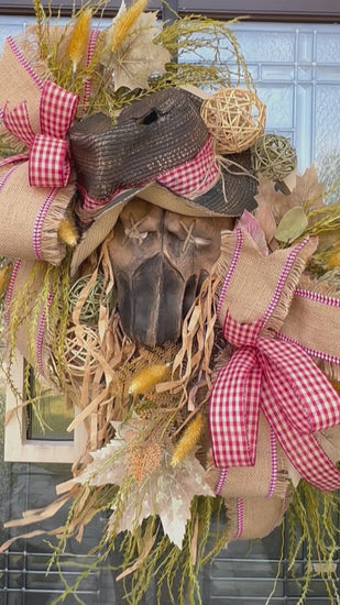 An upscale and modern take on the classic scarecrow villain. Filled with straw, greenery, maple leaves, designer ribbon, and scarecrow mask.