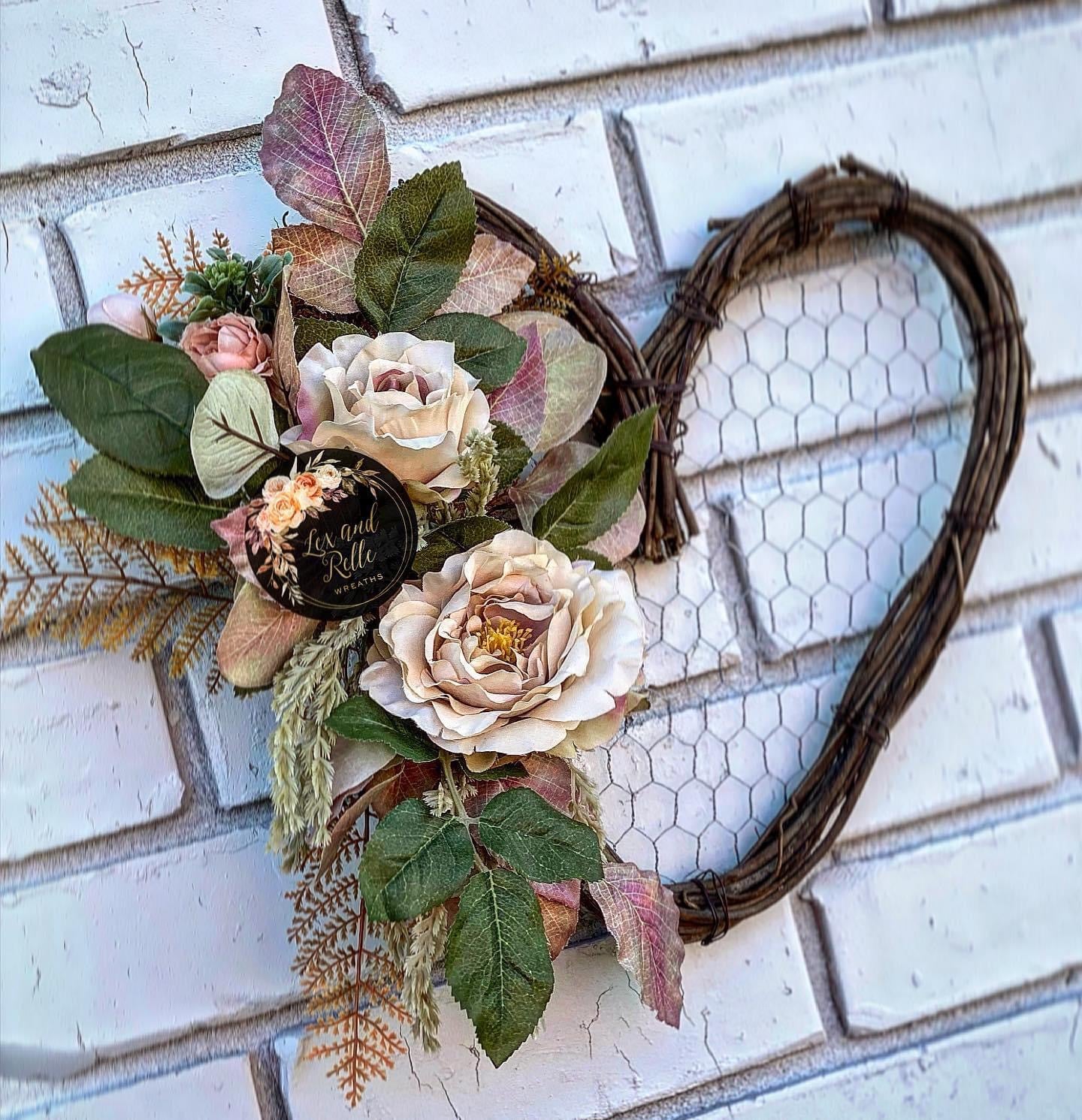 Muted Roses w/ Mixed Greenery Heart Wreath