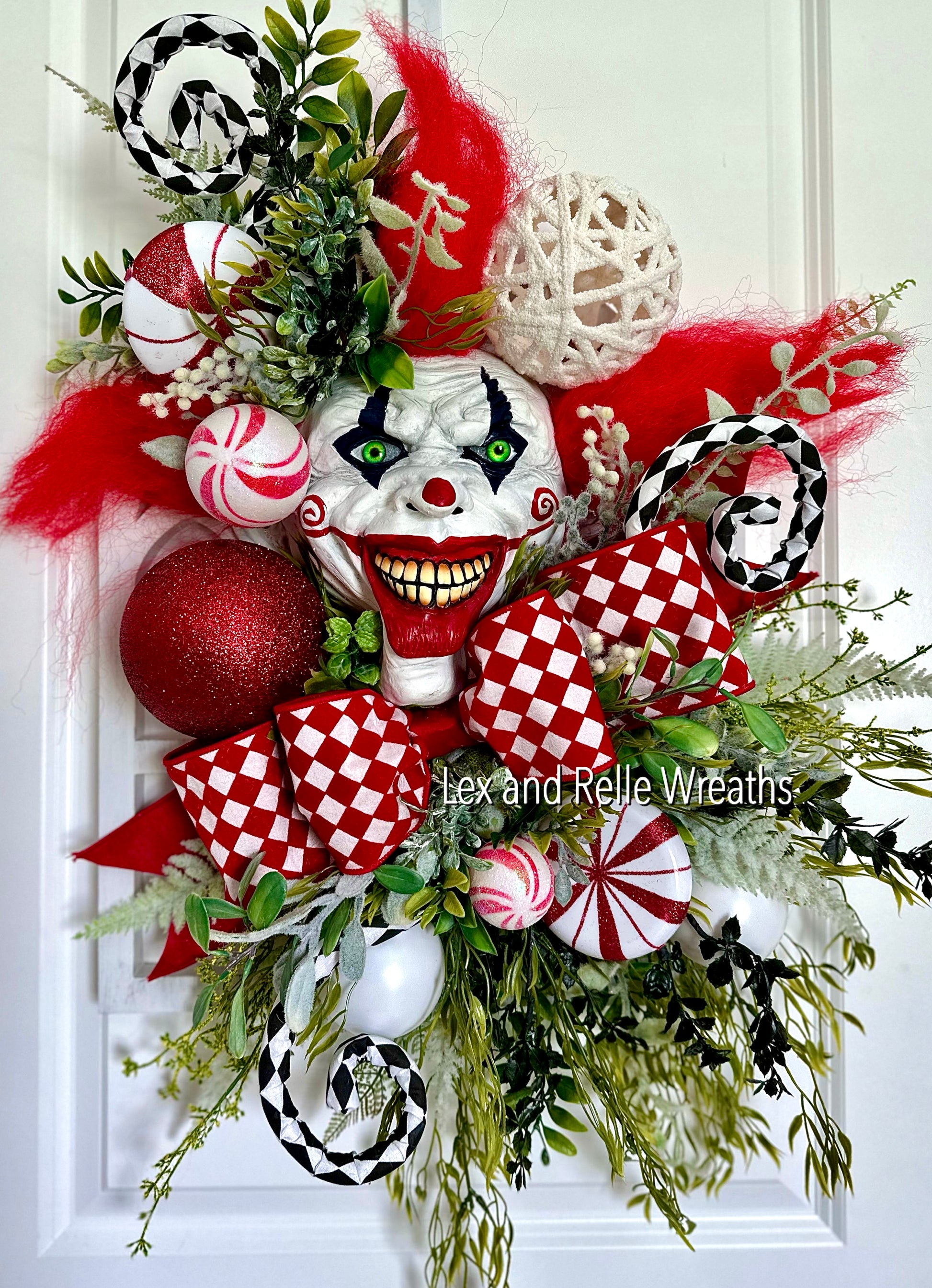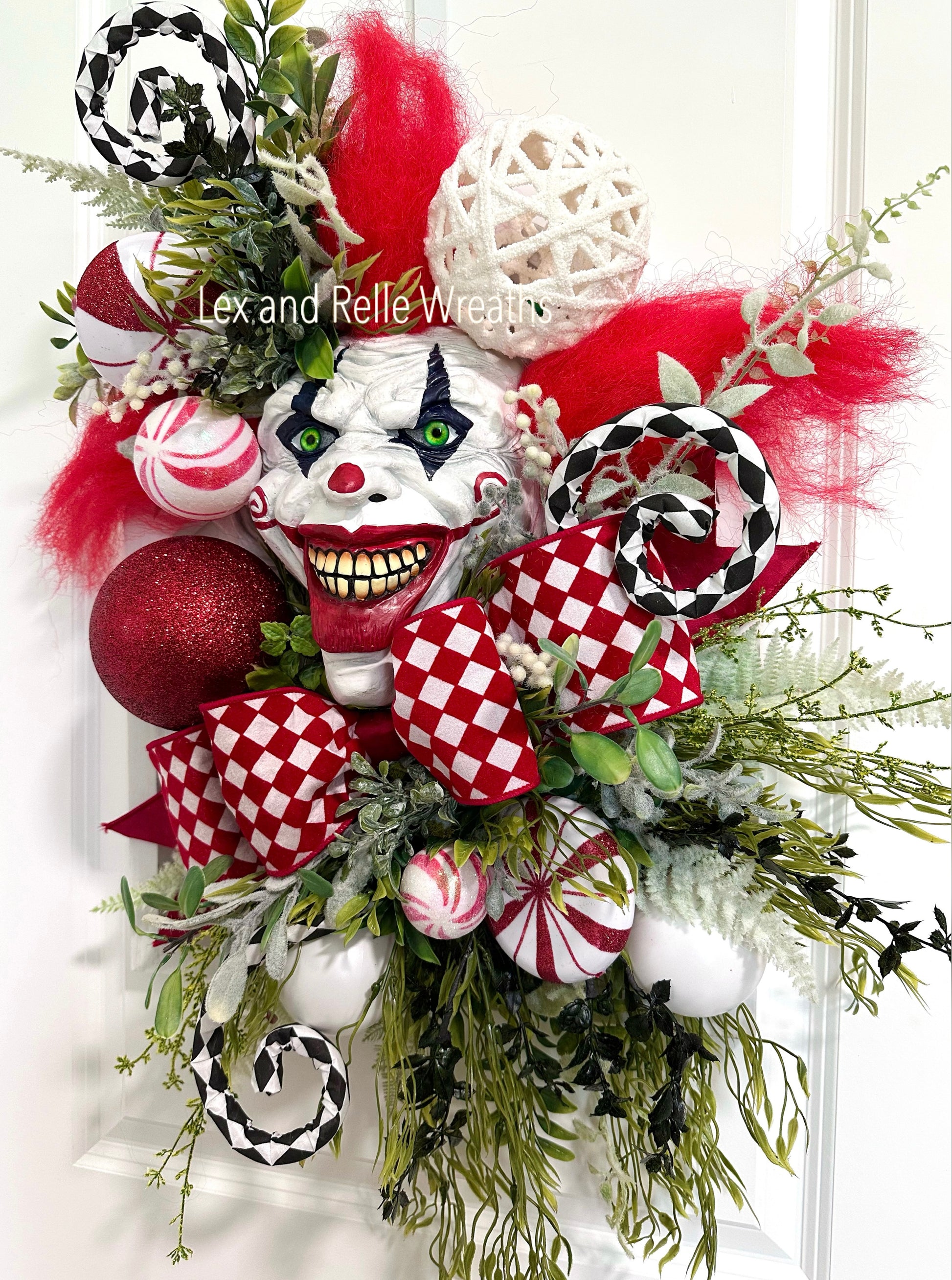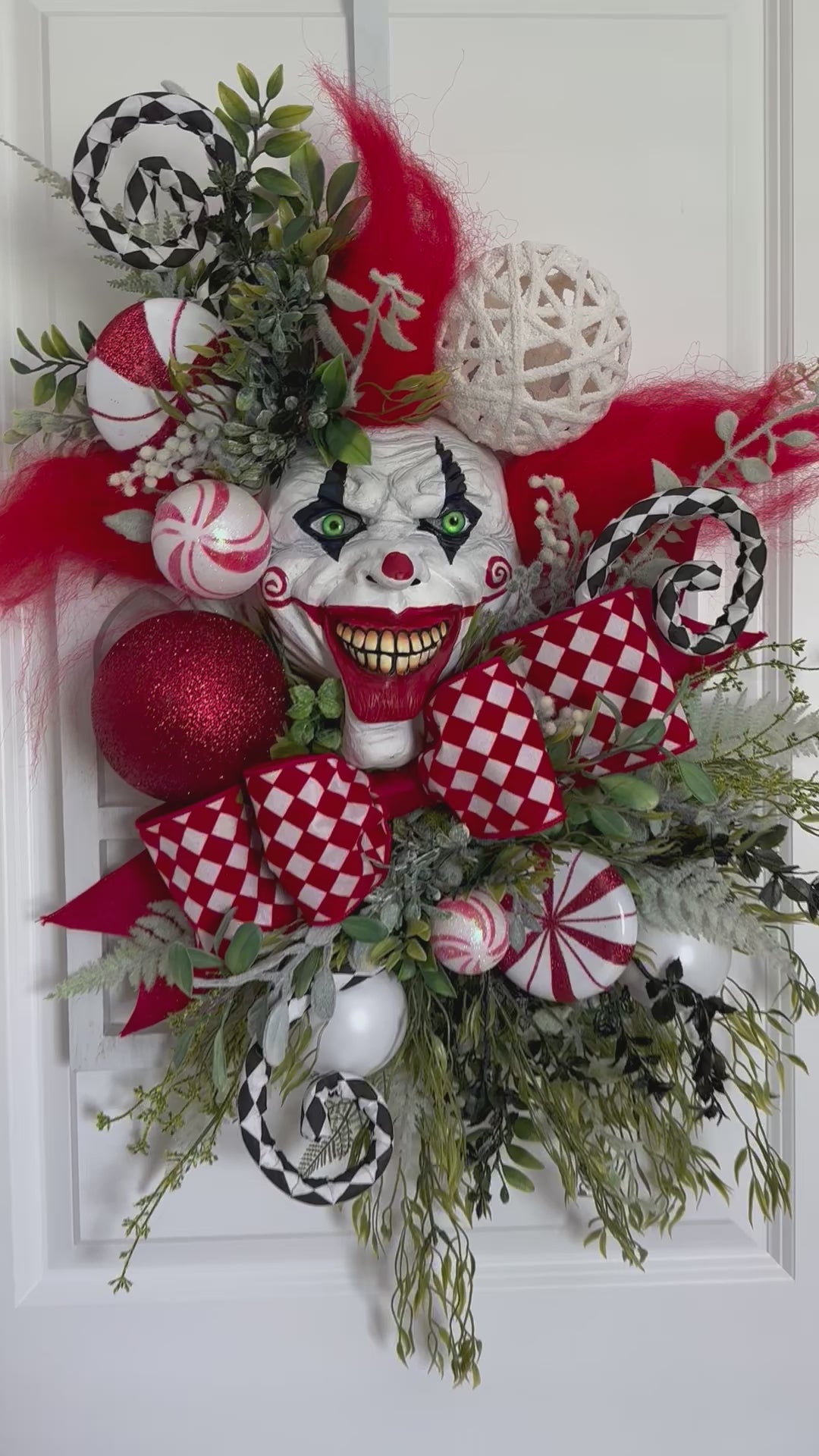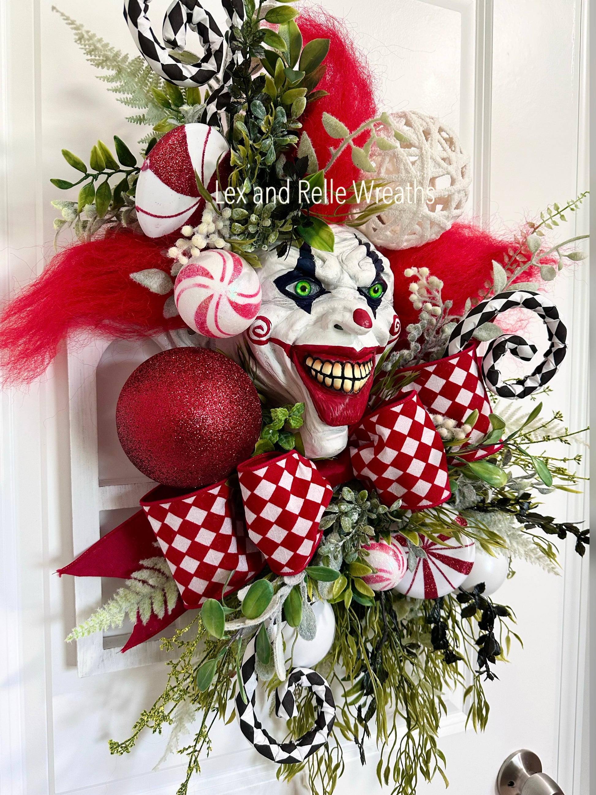 A twisted clown wreath filled with mixed greenery, fun peppermint discs and ornaments, harlequin curls & a giant red harlequin bow. Surprise your guests or scare them away. This wreath will surely do the job.