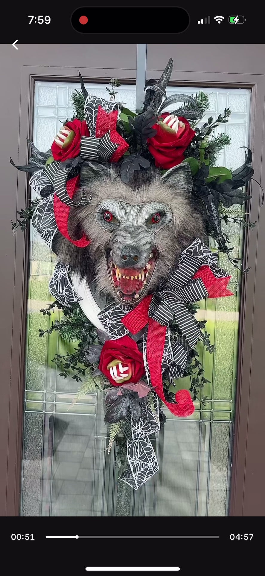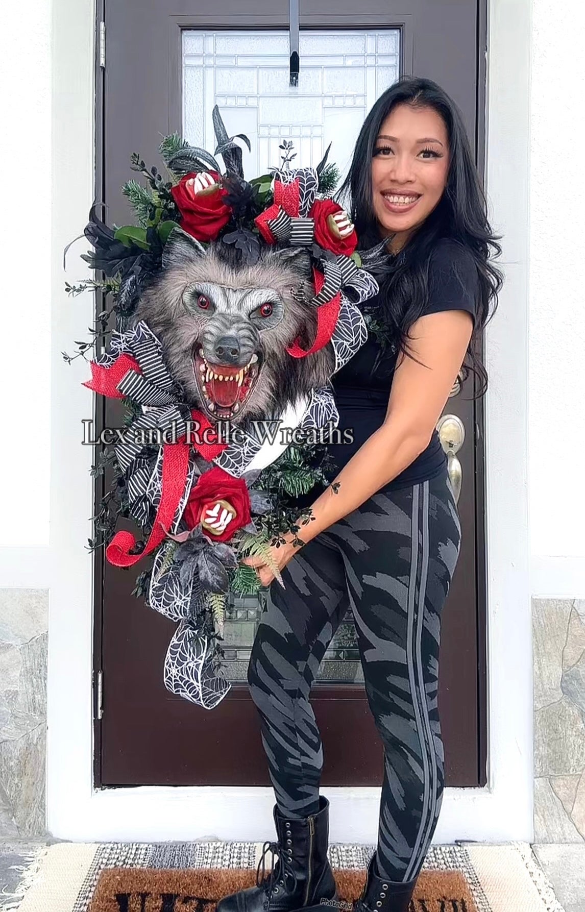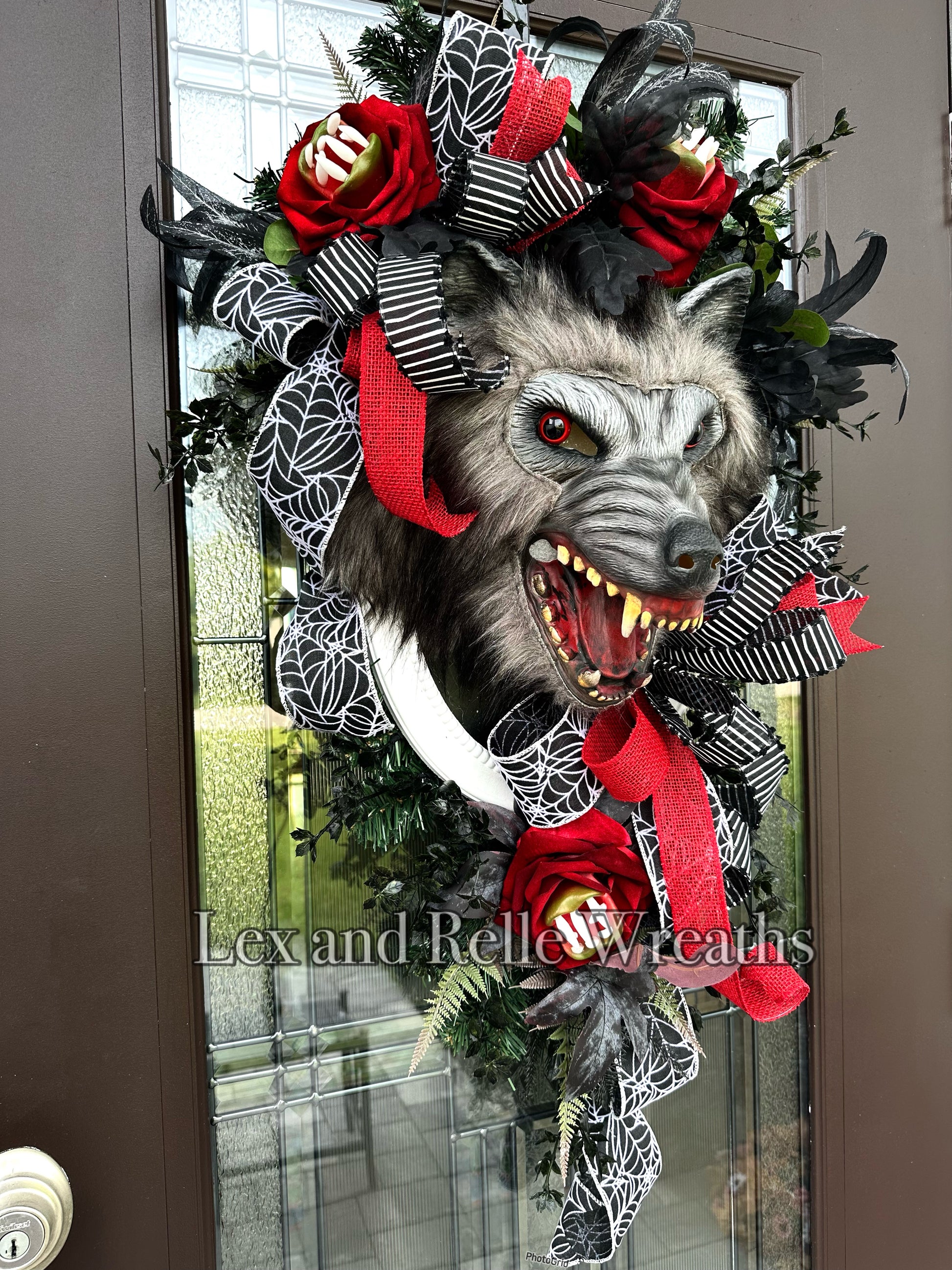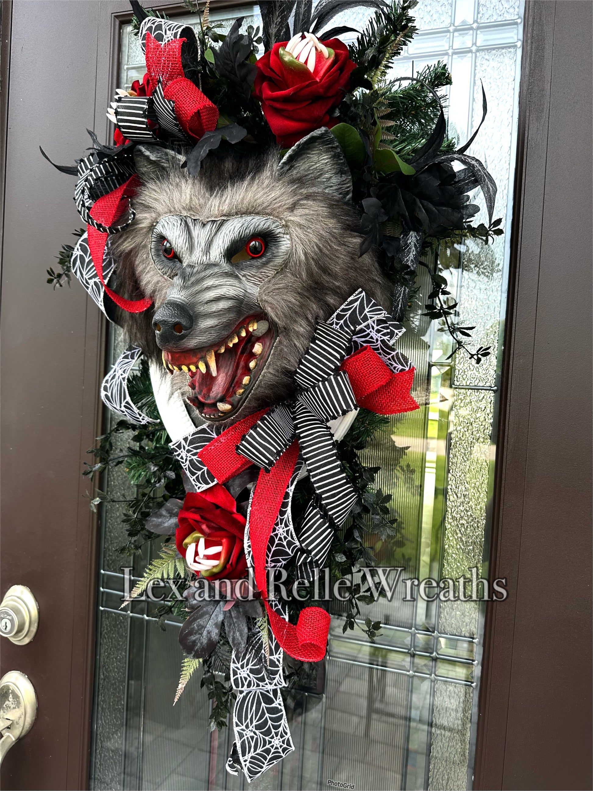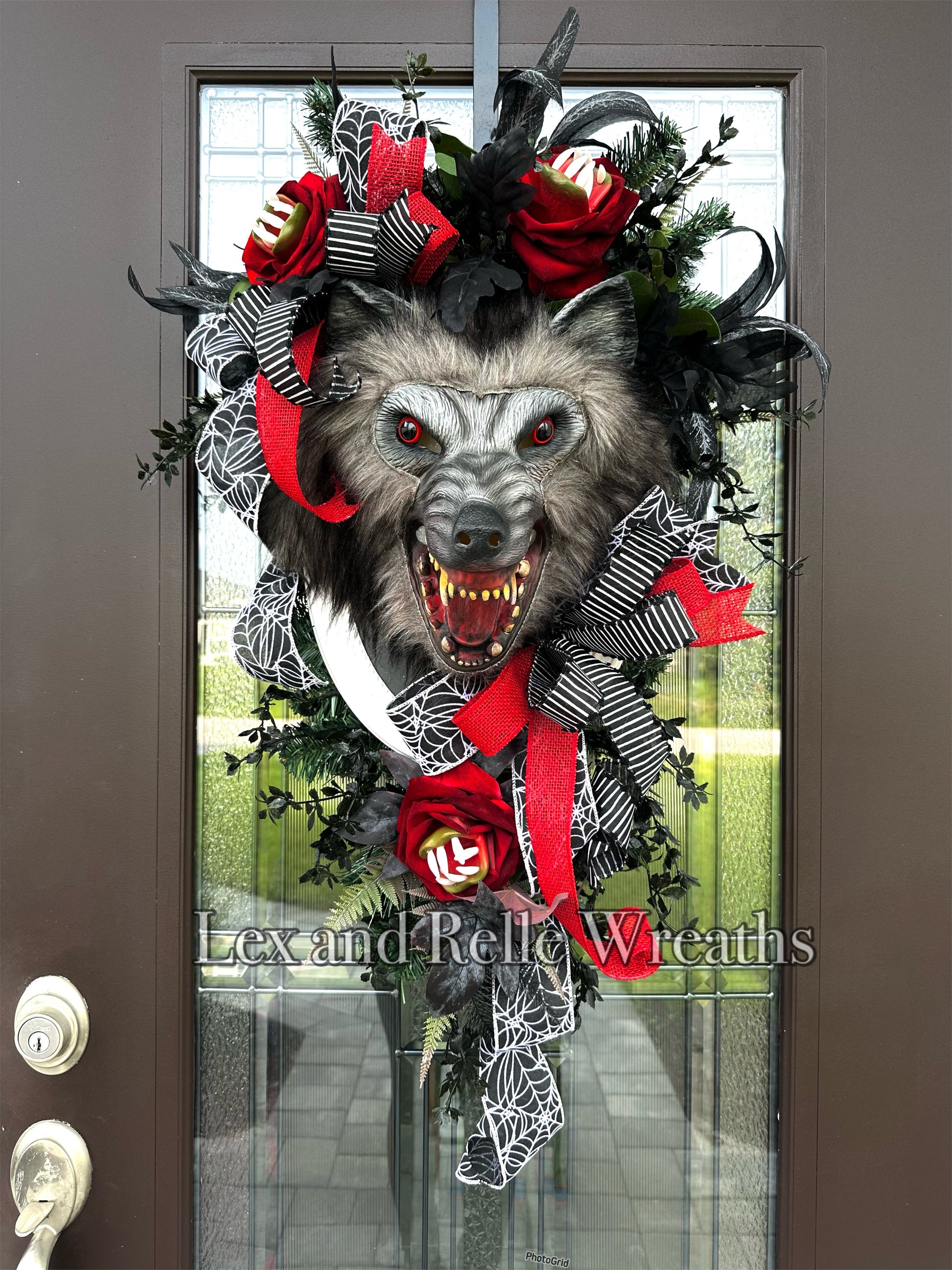 Wild Wolf Wreath, red black and gray Scary Halloween Swag decoration