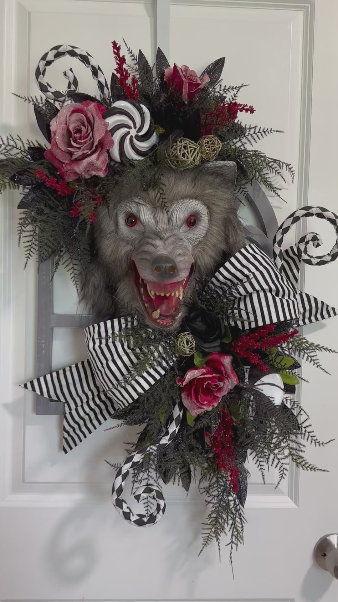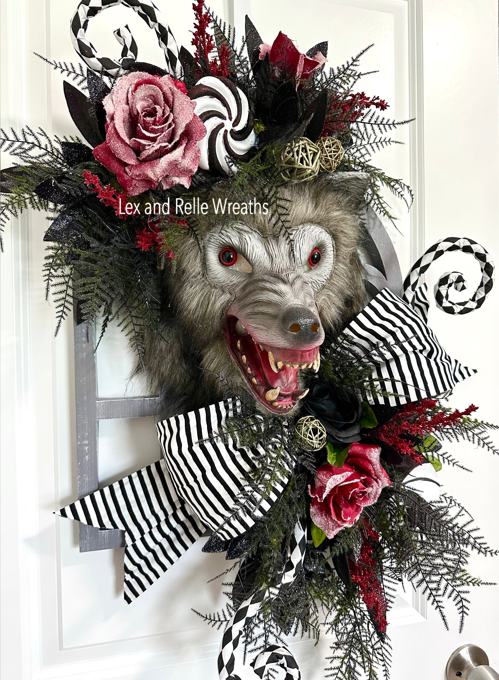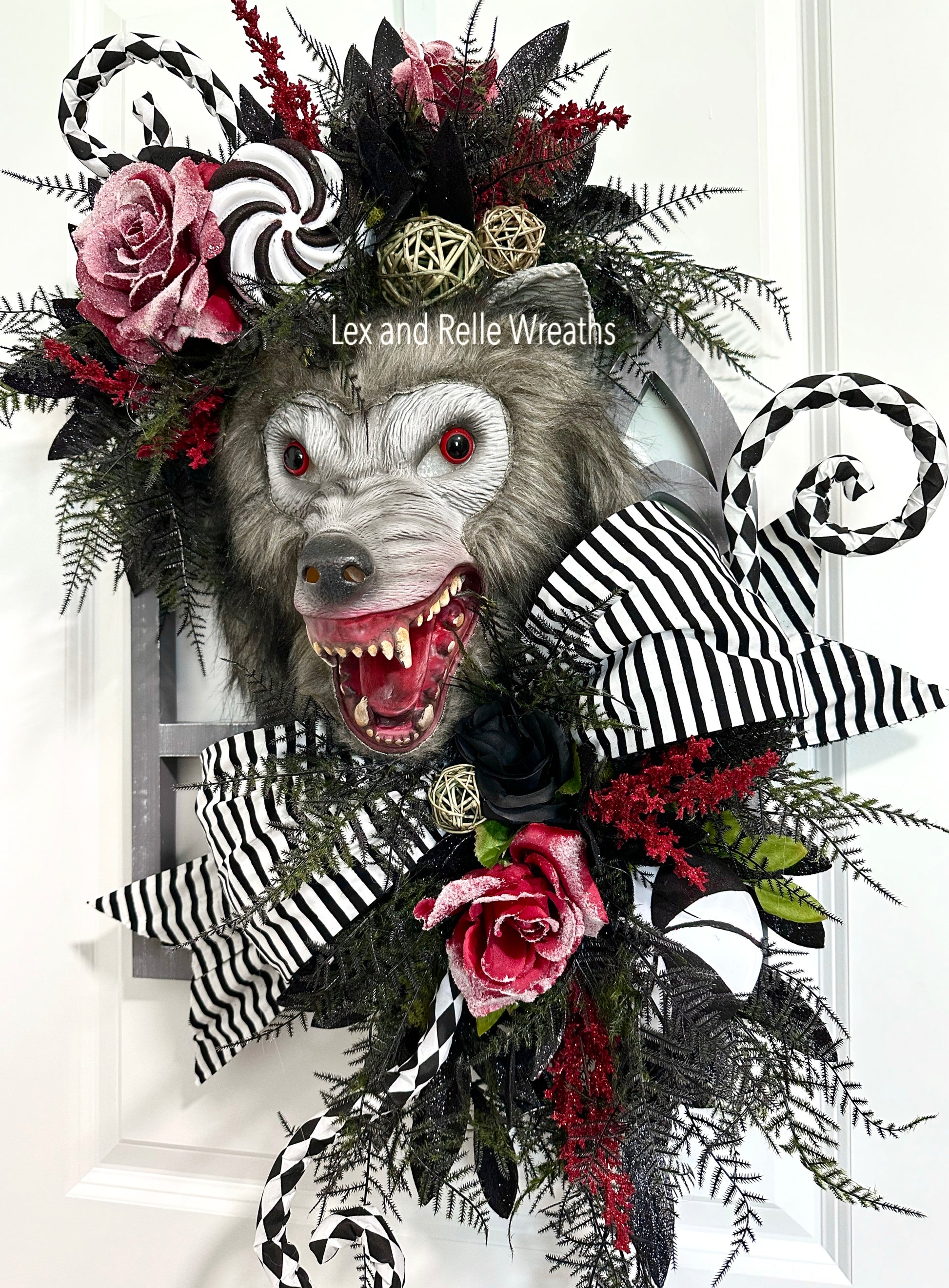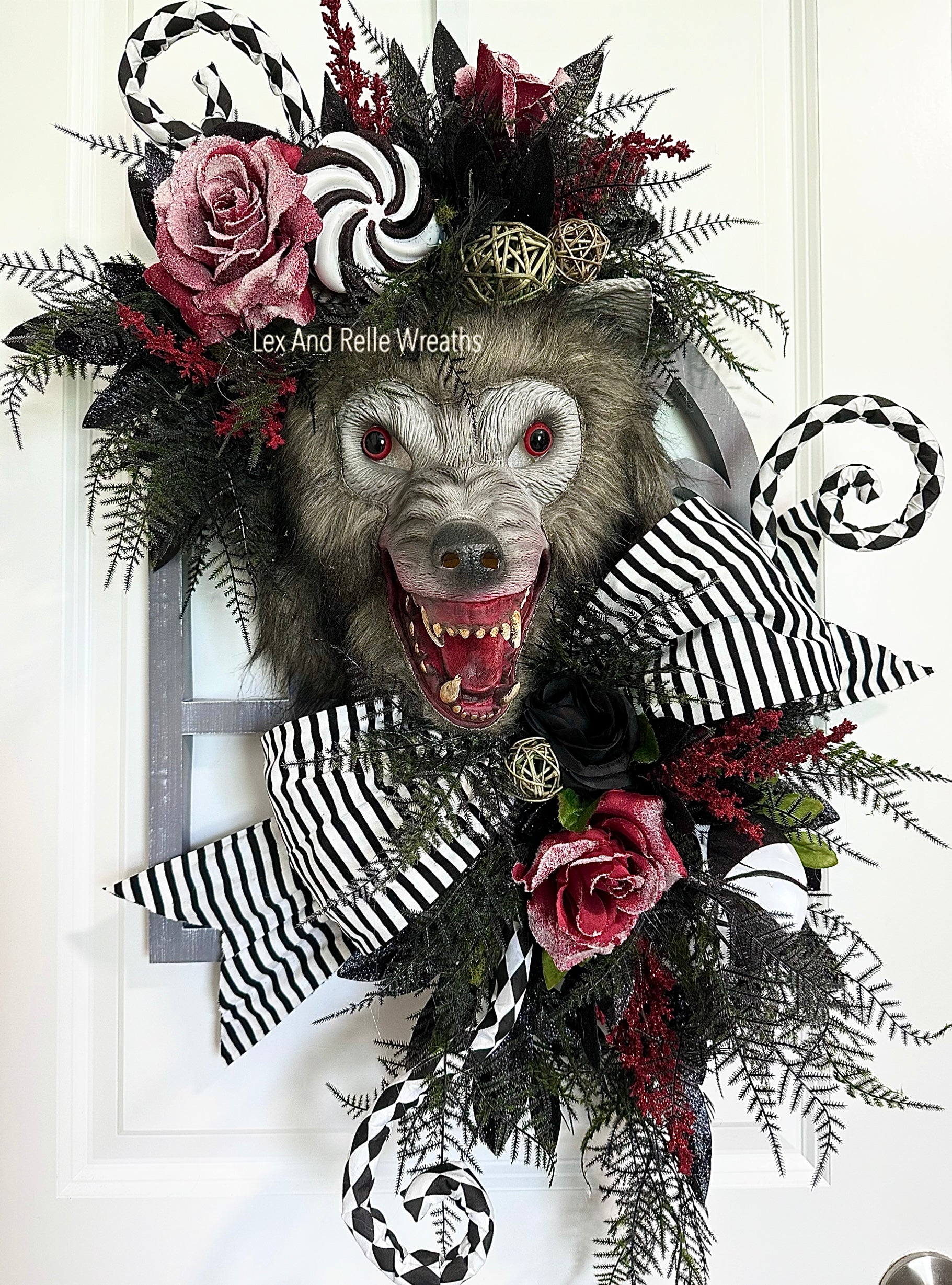 A spooky-pretty, elegant Werewolf design filled with frosty red roses, harlequin curls, glittery black greenery, black peppermint discs, and a giant bow. Charm your guests this year with a truly one of a kind wreath.