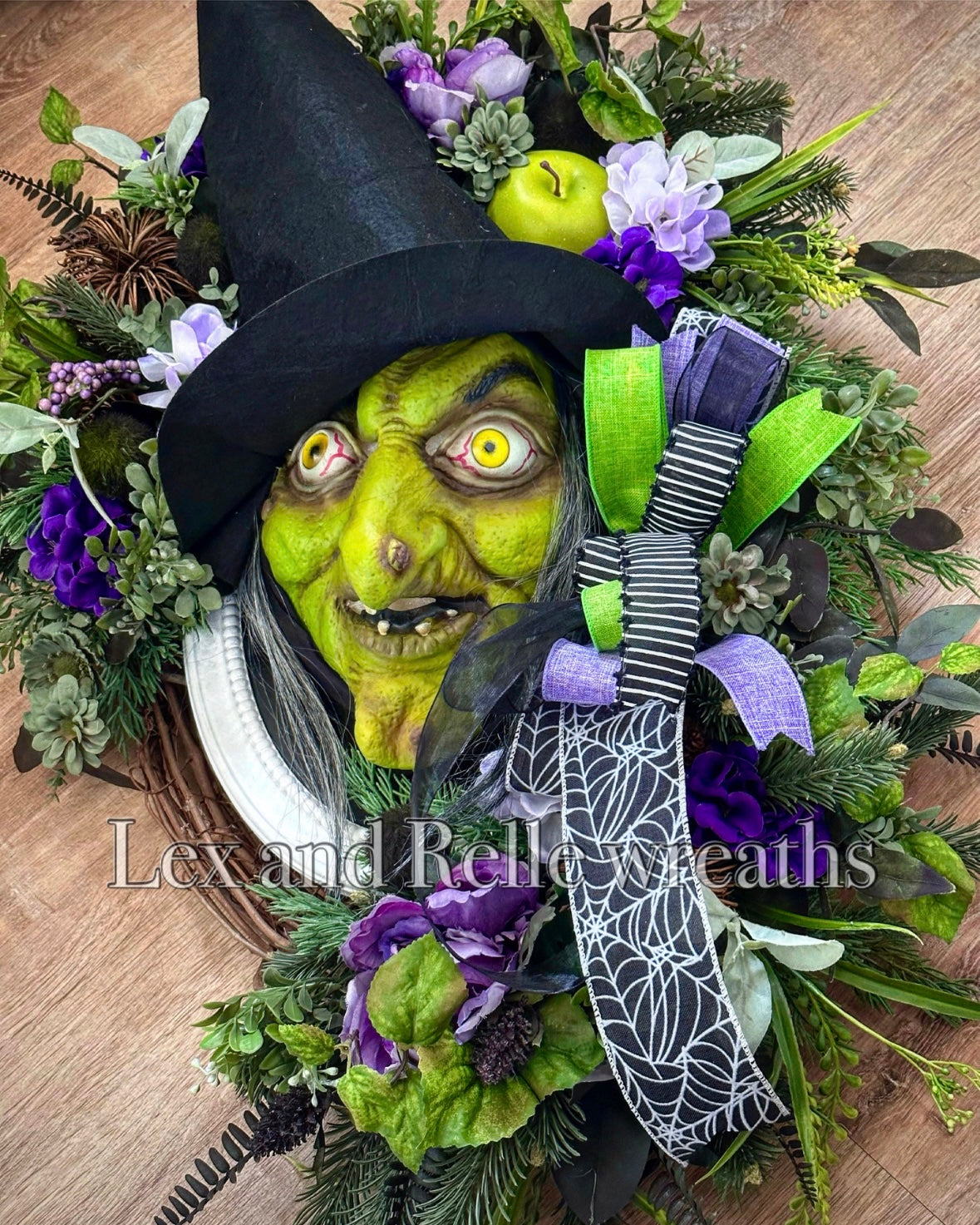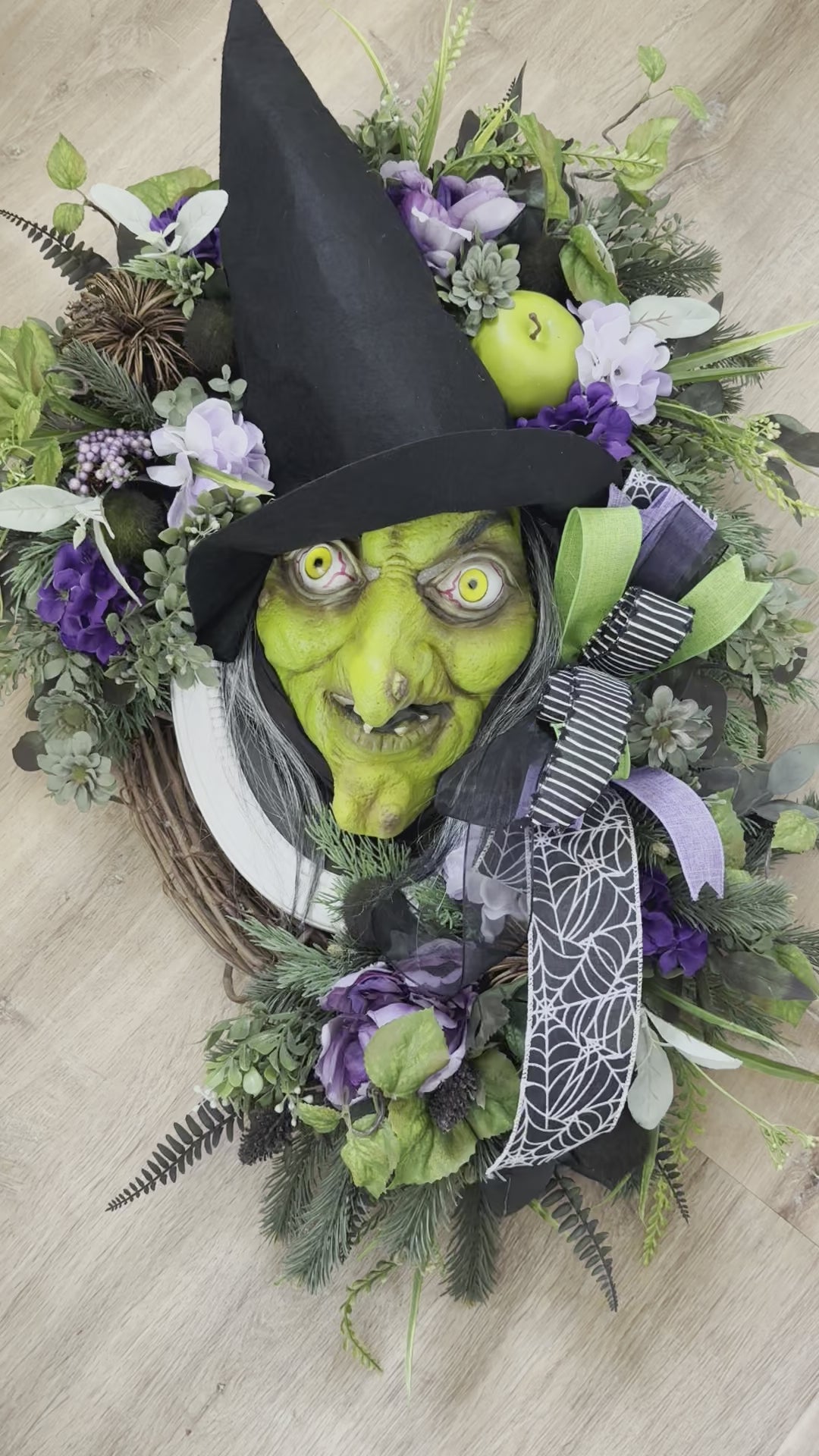 Greet your witchy friends with this spooky yet elegant Halloween witch wreath. She is large and filled with a variety of greenery, wicker pumpkins, a bright green apple, fancy bow, and a classically scary witch head.